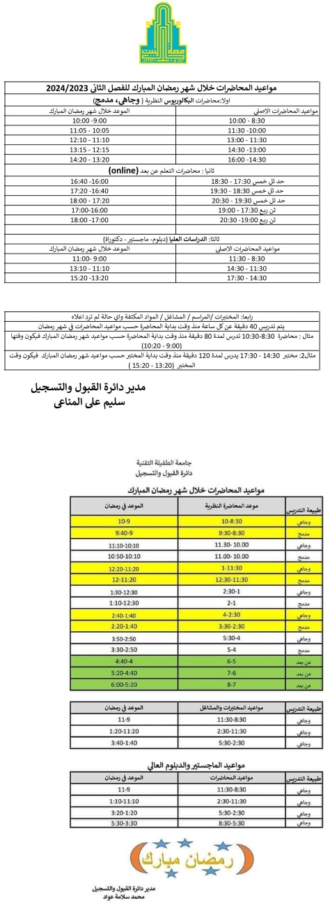 وبينت جامعة آل البيت والطفيلة التقنية مواعيد المحاضرات لطلبة البكالوريوس والدراسات العليا والدبلوم خلال شهر رمضان المبارك ووفقا للجداول المرفقة أدناه .