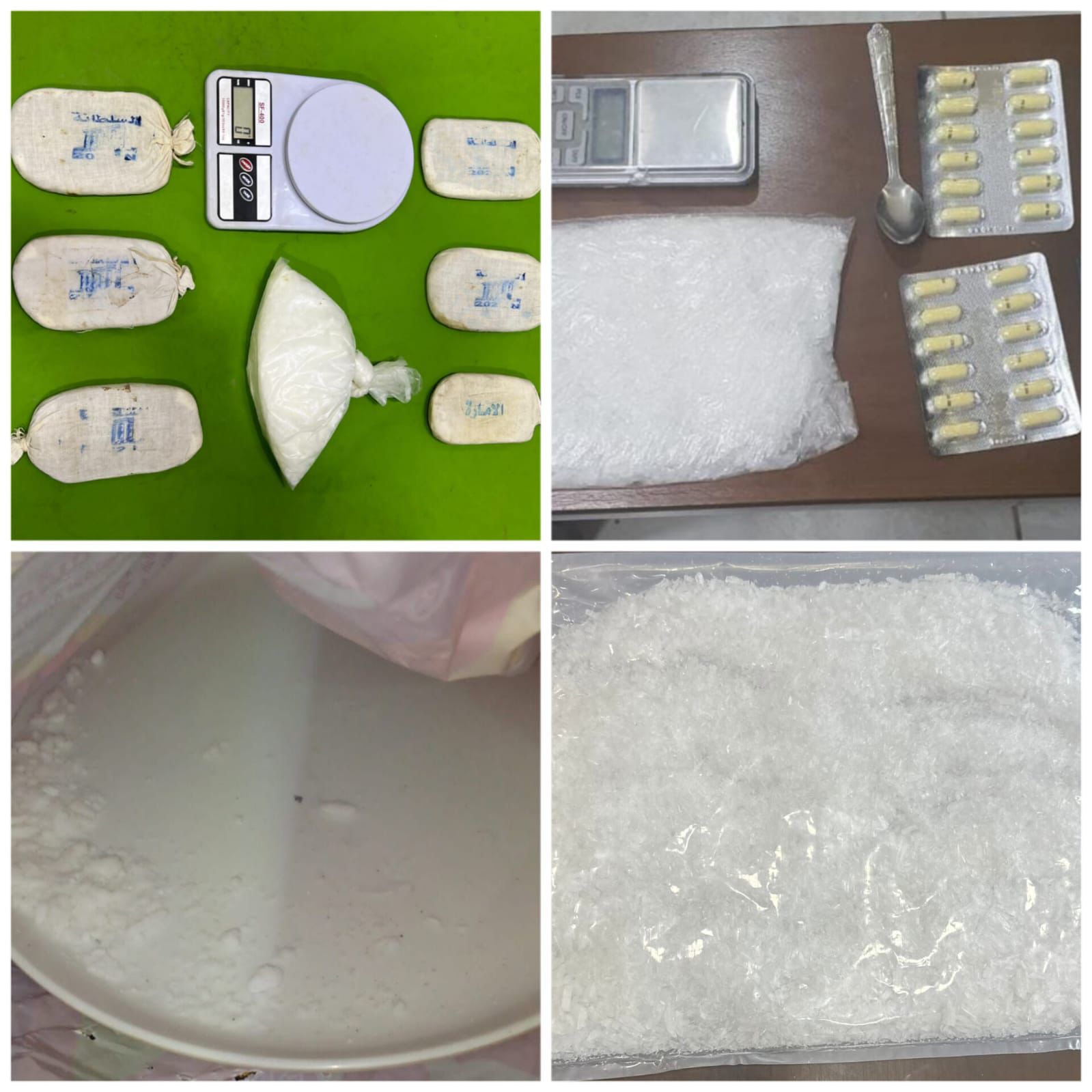 وفي محافظة الزرقاء أُلقي القبض على ثلاثة أشخاص بعد متابعة معلومات حول قيامهم بمباشرة تصنيع مادة الكريستال المخدرة، إذ جرى تحديد المنزل المُستخدم لتلك الغاية وضبط داخله كميات من المواد الكيميائية، إضافة إلى نصف كغم ضبطت بحوزة أحدهم .
