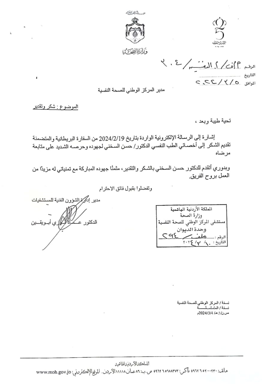 قام مدير إدارة الشؤون الفنية للمستشفيات في وزارة الصحة الدكتور عماد أبو يقين بتوجيه كتاب شكر لإختصاصي الطب النفسي الدكتور حسن السخني وذلك لجهوده وحرصه الشديد على متابعة مرضاه