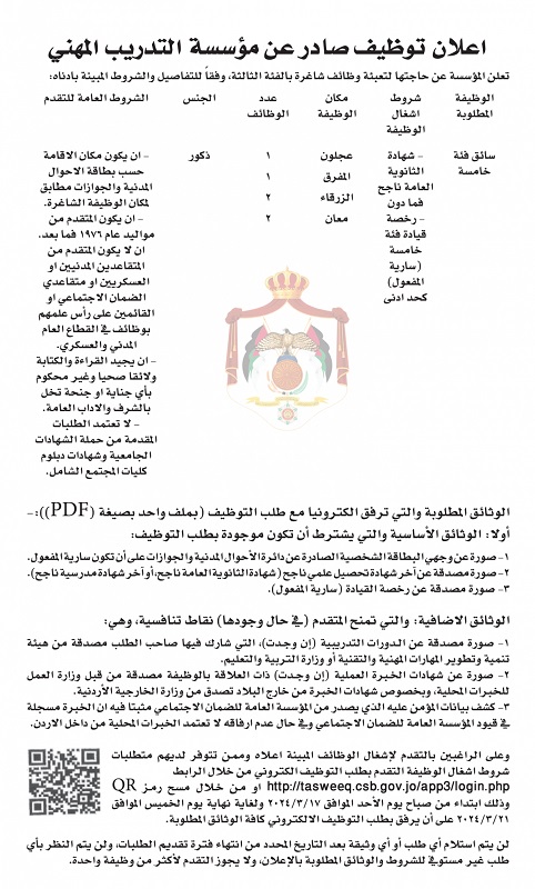 أعلنت مؤسسة التدريب المهني اليوم الأحد عن حاجتها لتعبئة وظائف شاغرة بالفئة الثالثة.