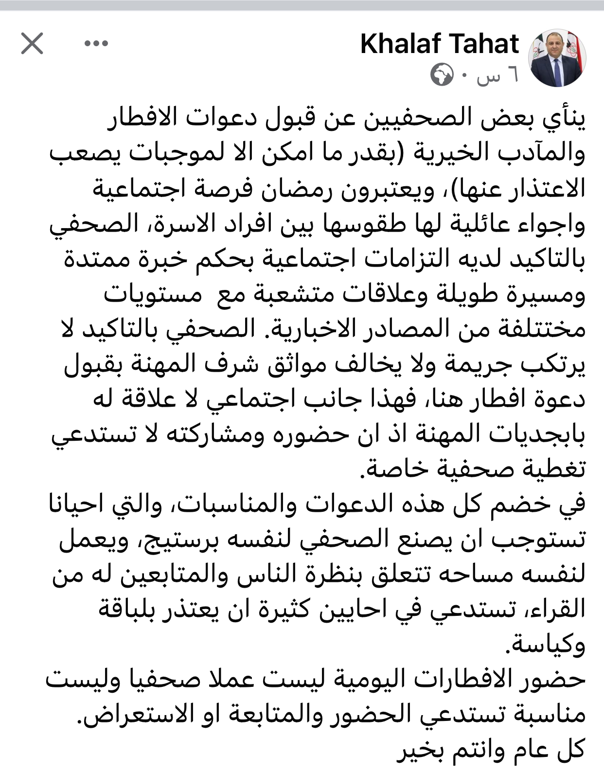 حضور الافطارات اليومية ليست عملا صحفيا وليست مناسبة تستدعي الحضور والمتابعة او الاستعراض.
