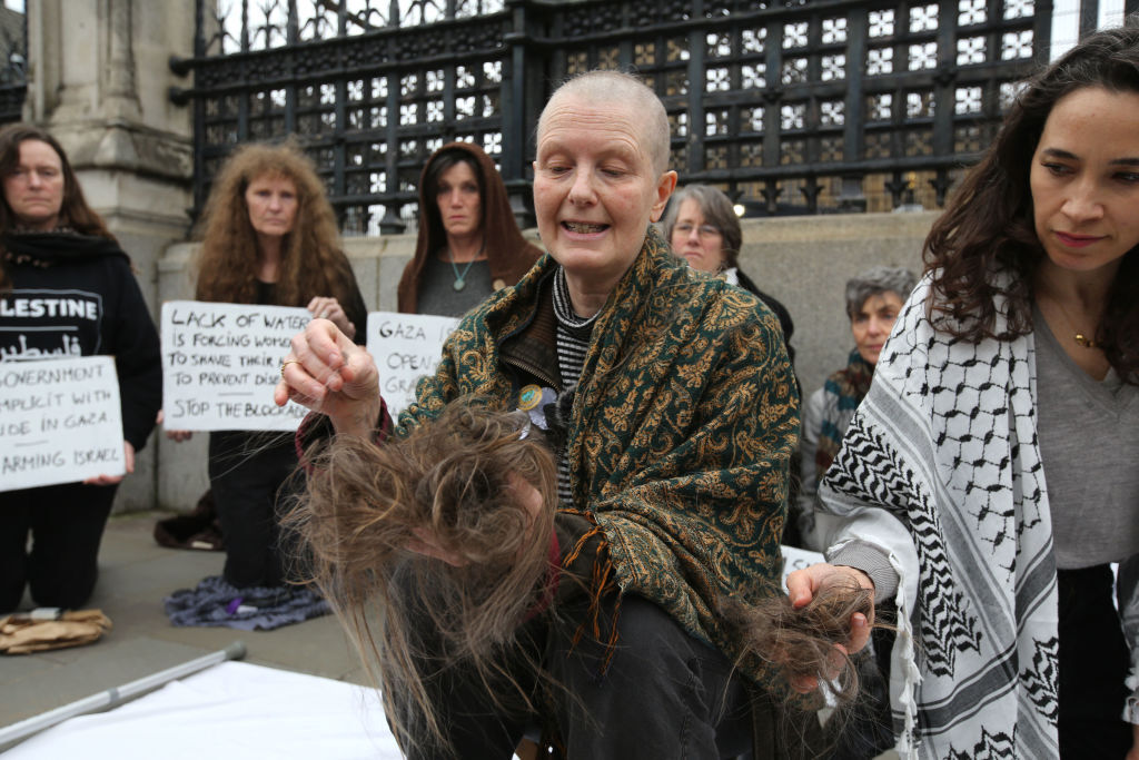 بريطانيات يحلقن رؤوسهن أمام البرلمان تضامنا مع نساء غزة – فيديو وصور