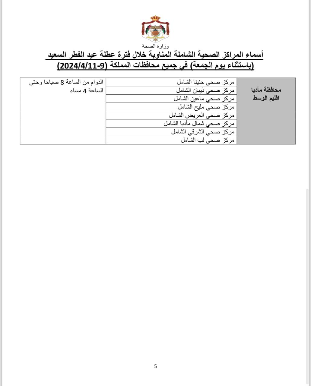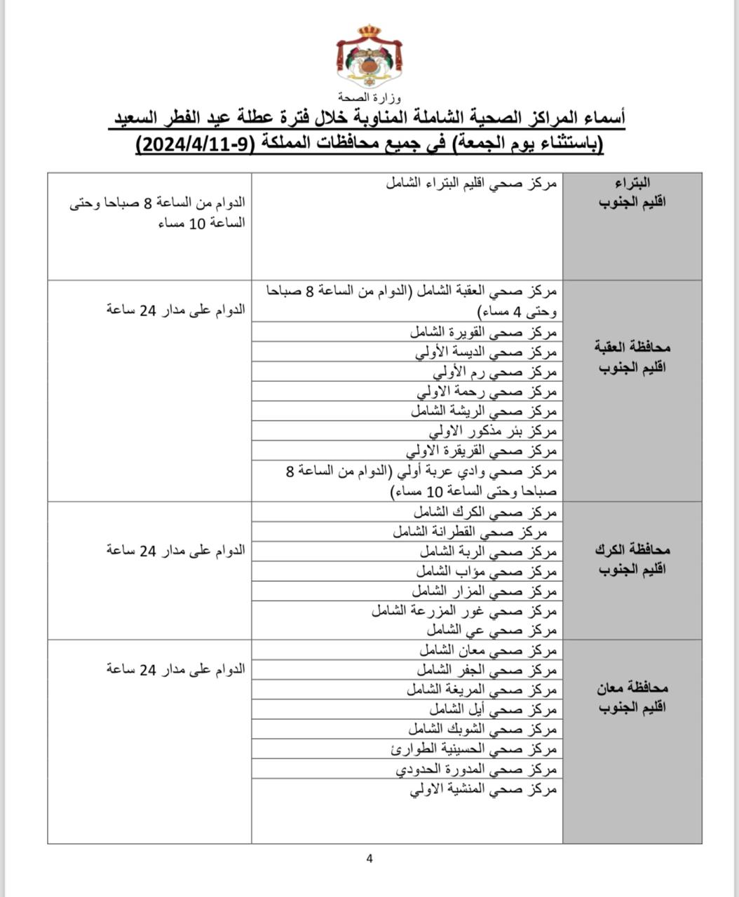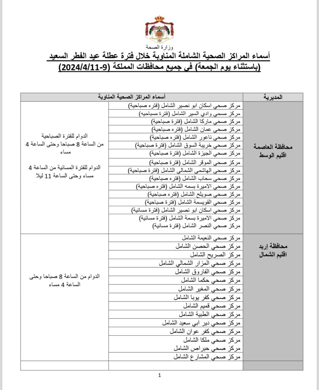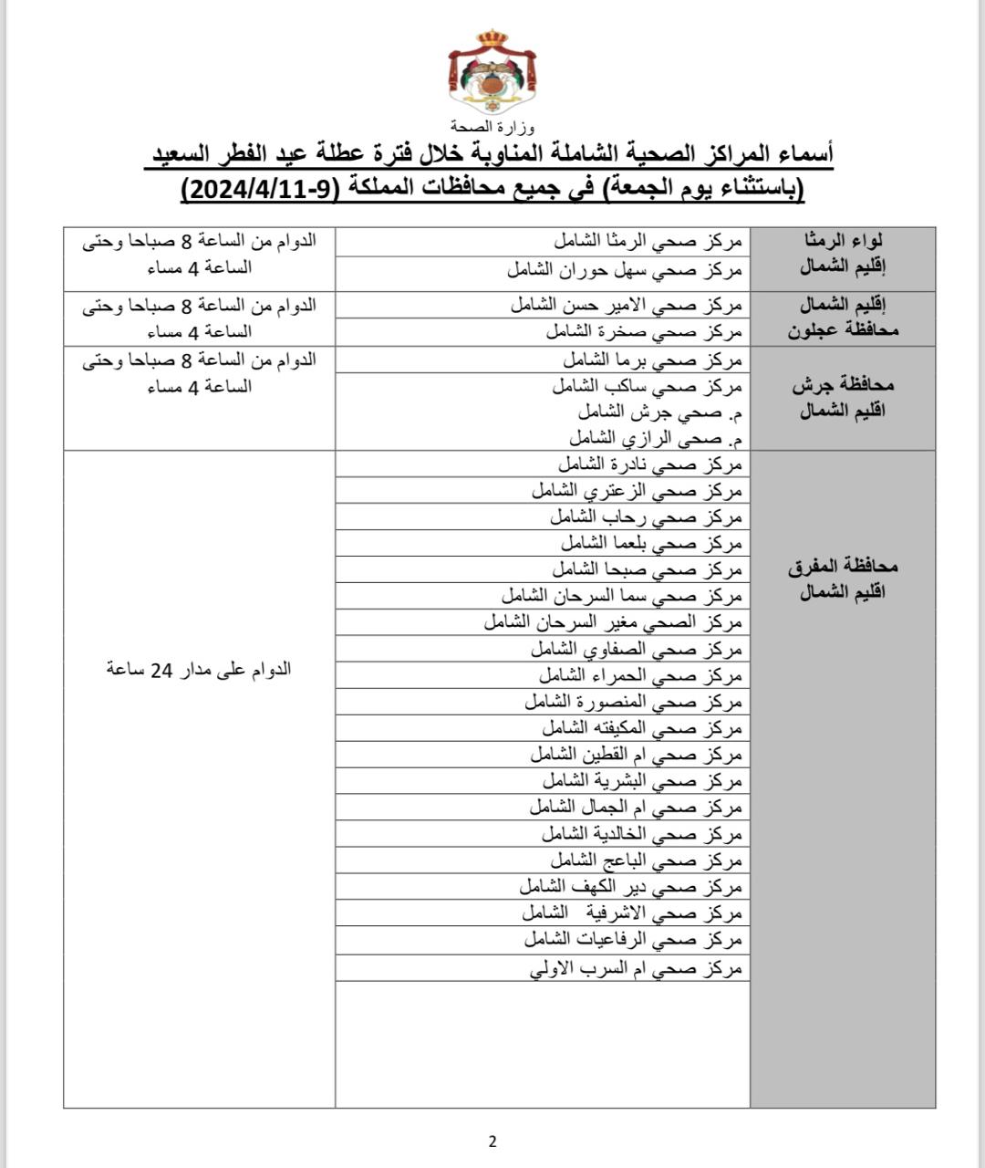 أعلنت وزارة الصحة اليوم الاثنين أسماء مراكزها الصحية المناوبة في جميع المحافظات خلال فترة عطلة عيد الفطر السعيد "ما عدا يوم الجمعة" والبالغ عددها 112 مركزا صحيا شاملاً وأولياً.
