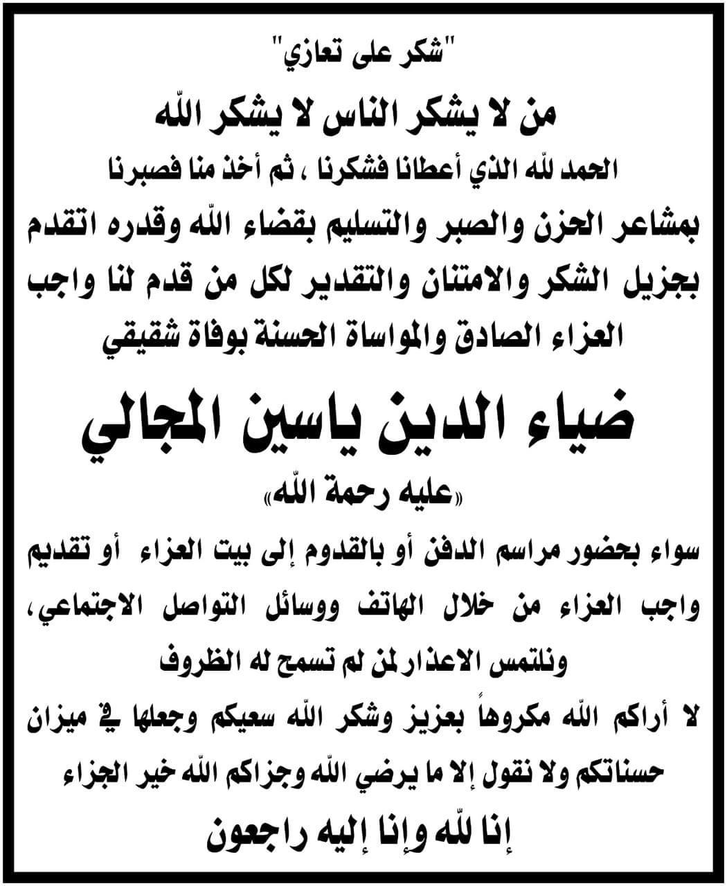 شكر على تعاز بالمأسوف على شبابه ضياء الدين ياسين المجالي .