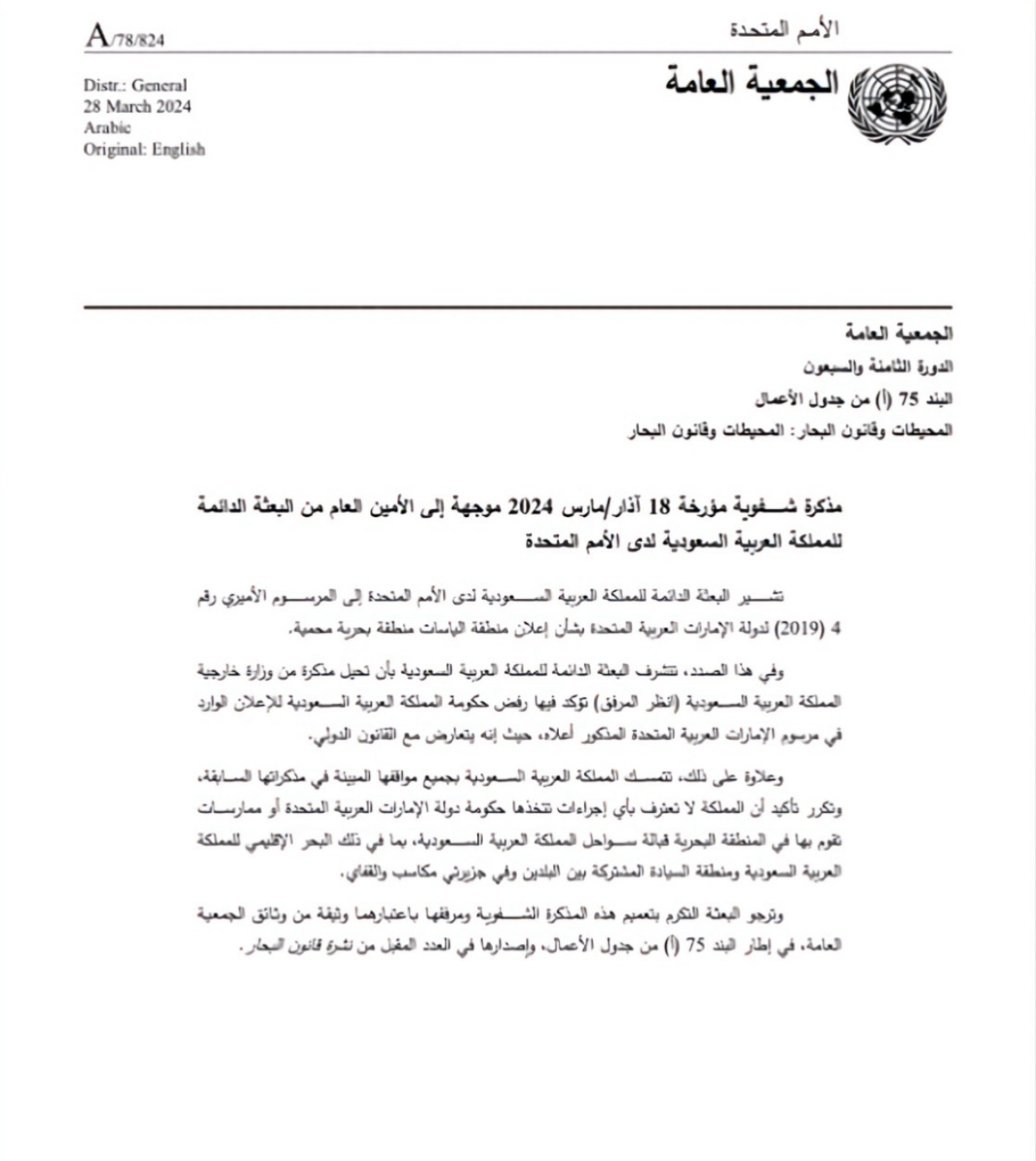 واعتبرت المملكة المذكرة رسمية وطالبت الأمم المتحدة بتعميمها على أعضاء الأمم المتحدة وفق الإجراءات المتبعة