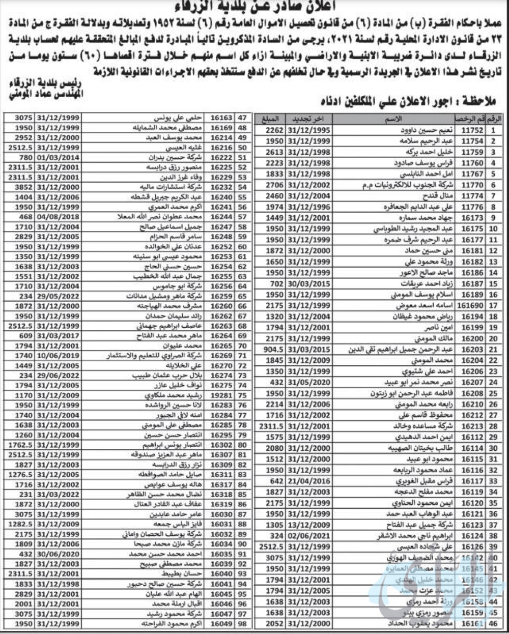 بلدية الزرقاء تنشر أسماء مواطنين ترتبت عليهم مبالغ مالية