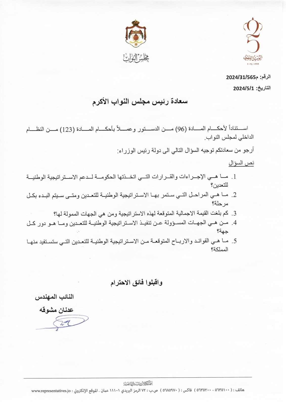 وجه النائب المهندس عدنان مشوقة سؤالا نيابيا إلى رئيس الوزراء حول الاستراتيجية الوطنية للتعدين، استنادًا إلى أحكام المادة (96) من الدستور وعملاً بأحكام المادة (123) من النظام الداخلي لمجلس النواب.