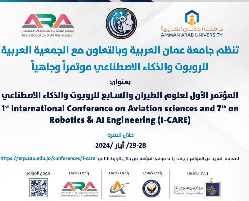 انطلاقا من رؤية جامعة عمان العربية ورسالتها المستمرة في خدمة القضايا العلمية المحلية والإقليمية والعالمية بما يخدم التنمية المستدامة والحفاظ عليها في مجال الطيران والروبوتات والذكاء الاصطناعي، تعقد جامعة عمان العربية خلال الفترة 28-29/ أيار 2024 وبالتعاون مع الجمعية العربية للروبوت والذكاء الاصطناعي المؤتمـر الأول لعلـوم الطـيران والسـابع للروبوت والذكـاء الاصـطناعـي وجاهياً
