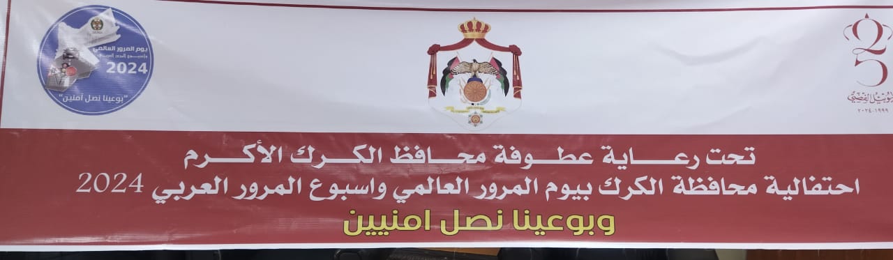 رعى مساعد محافظ الكرك عطوفة المتصرف خالد توفيق الجعافرة بحضور عطوفة نائب مدير الشرطة ورئيس مجلس المحافظه وعدد من رؤساء البلديات وعدد من مدراء الدوائر الرسمية وفعاليات المجتمع المحلي احتفالية محافظة الكرك بيوم المرور العالمي واسبوع المرور العربي لعام 2024 والتي جاءت تحت شعار (بوعينا نصل أمنين)