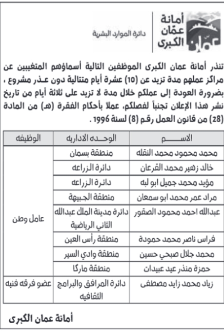 أنذرت أمانة عمان الكبرى، اليوم الاثنين، 9 عمال، بالعودة إلى عملهم، وإلا سيتم فصلهم نتيجة تغيبهم عن العمل لمدة تزيد عن 10 أيام.