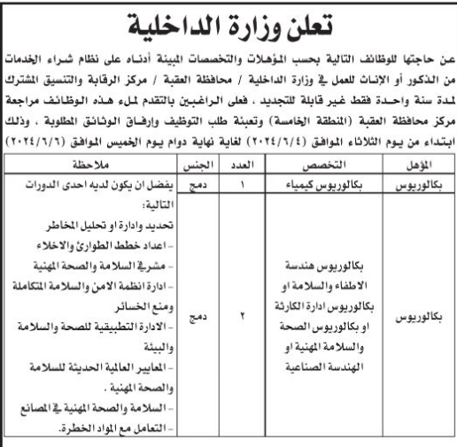 أعلنت وزارة الداخلية عن حاجتها لتعبئة وظائف شاغرة لديها، على نظام شراء الخدمات من الذكور والإناث.