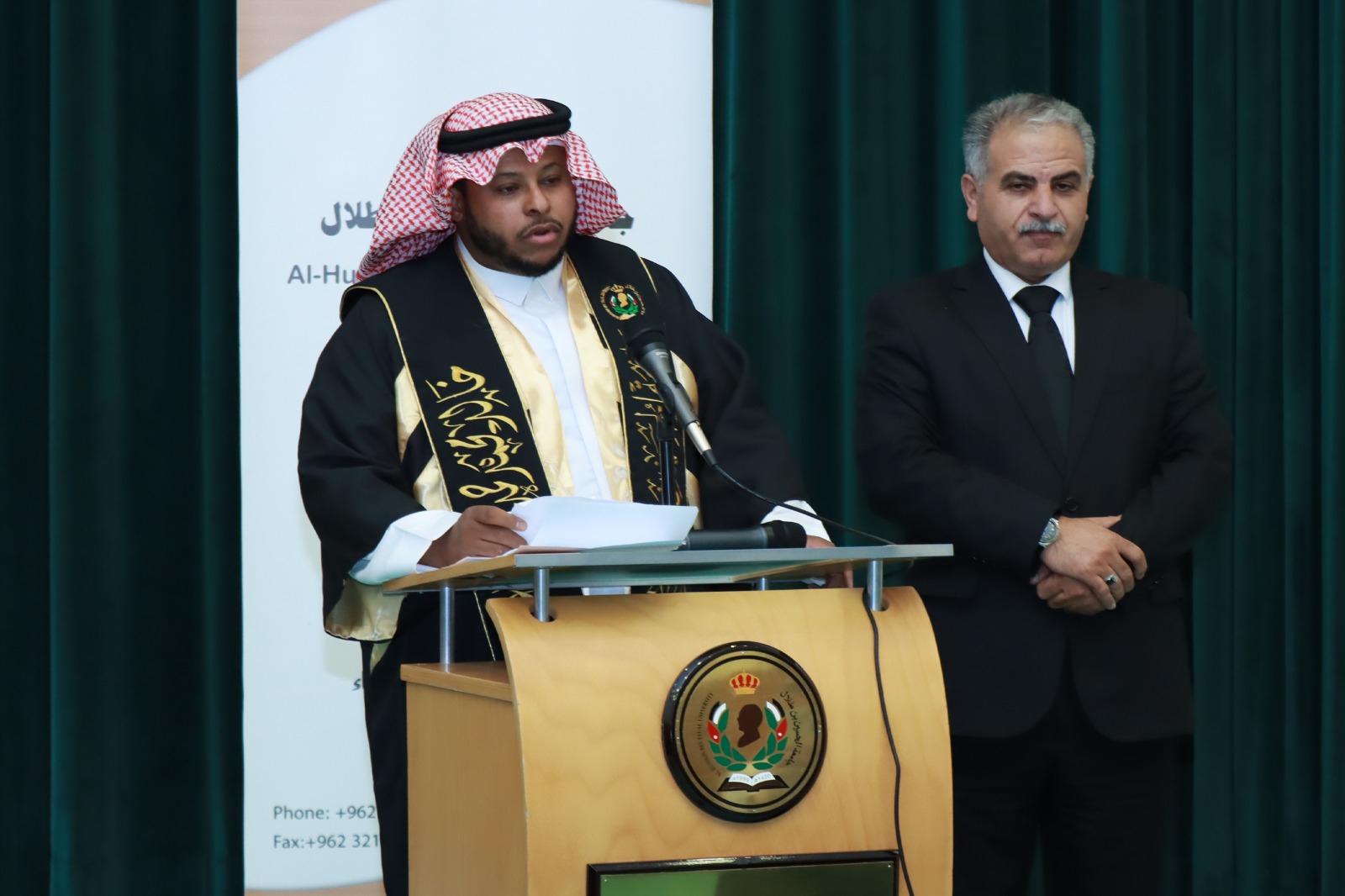 وفي كلمته مندوباً عن الطلبة الخريجين شكر الطالب خالد محمد الشاعري رئاسة الجامعة والهيئة التدريسية في كلية العلوم التربوية على الدعم الذي لاقاه الطلبة السعوديين خلال فترة دراستهم، مبيناً أنهم كانوا خير موجه لهم. مؤكدا على عمق العلاقات الأخوية بين البلدين، فهم لم يشعروا في غربة، بل أخوة وتقدير من الجميع.