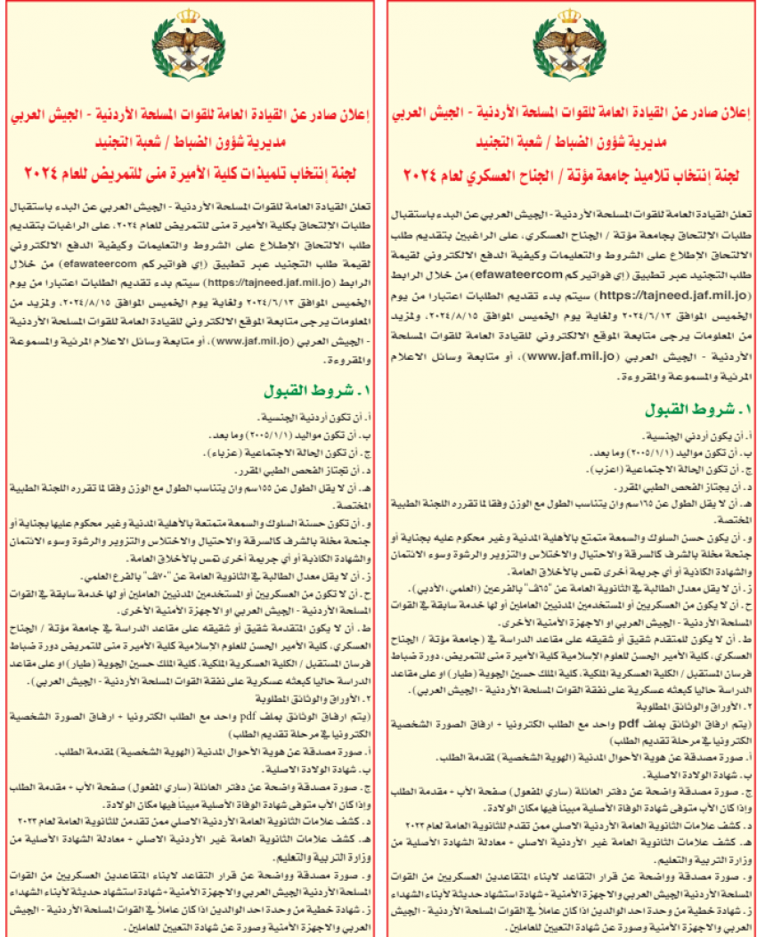 أعلنت القيادة العامة للقوات المسلحة الأردنية – الجيش العربي عن البدء باستقبال طلبات الالتحاق بجامعة مؤتة / الجناح العسكري للعام 2024، وكذلك البدء باستقبال طلبات الالتحاق بكلية الأميرة منى للتمريض .ودعت الراغبين والراغبات بتقديم طلبات الالتحاق الاطلاع على الشروط والتعليمات وكيفية الدفع الإلكتروني لقيمة طلب التجنيد عبر تطبيق (إي فواتيركم EFAWATEERCOM) يرجى مراجعة الموقع الإلكتروني لطلبات التجنيد على الرابط (HTTP:TAJNEED.JAF.MIL.JO).وسيتم بدء تقديم الطلبات اعتبارا من اليوم الخميس الموافق 13/6/2024 ولغاية يوم الخميس الموافق 15/8/2024، وللمزيد من المعلومات يرجى متابعة الموقع الإلكتروني للقيادة العامة للقوات المسلحة الأردنية – الجيش العربي (WWW.JAF.MIL.JO) أو متابعة وسائل الإعلام المرئية والمسموعة و المقروءة .