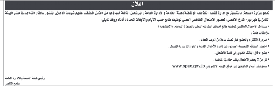 دعت وزارة الصحة، بالتنسيق مع إدارة تقييم الكفايات الوظيفية هيئة الخدمة والإدارة العامة، المرشحين التالية أسماؤهم التواجد في مبنى الهيئة الكائن في طبربور - شارع الأقصى لحضور الامتحان التنافسي العملي لوظيفة طابع.