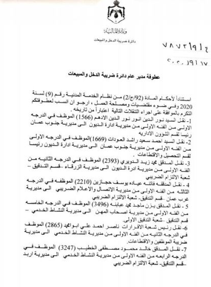 قرر مدير عام دائرة ضريبة الدخل والمبيعات حسام أبو علي اليوم الخميس اجراء عدد من التنقلات في الدائرة وجاءت كما يلي :