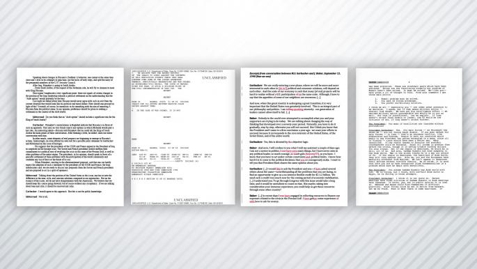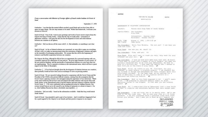 تشرح وثائق "شراكة غورباتشوف - بوش في مرحلة حرب الخليج الأولى 1990"، كيف انضم الرئيس السوفييتي ميخائيل غورباتشوف بشكل تدريجي، إلى الرفض الأميركي لعدوان صدام على الكويت (وقع في 2 أغسطس/آب من عام 1990)، بالرغم من اعتراضاته المبدئية على استخدام القوة في الخليج خلال خريف عام 1990، وما جرى في الأثناء من جمع تمويل للحملة الهادفة إلى إخراج العراق من الكويت بقيمة 50 مليار دولار، بينما لم يحظ الاقتصاد السوفييتي المنهك بأي مساعدة.