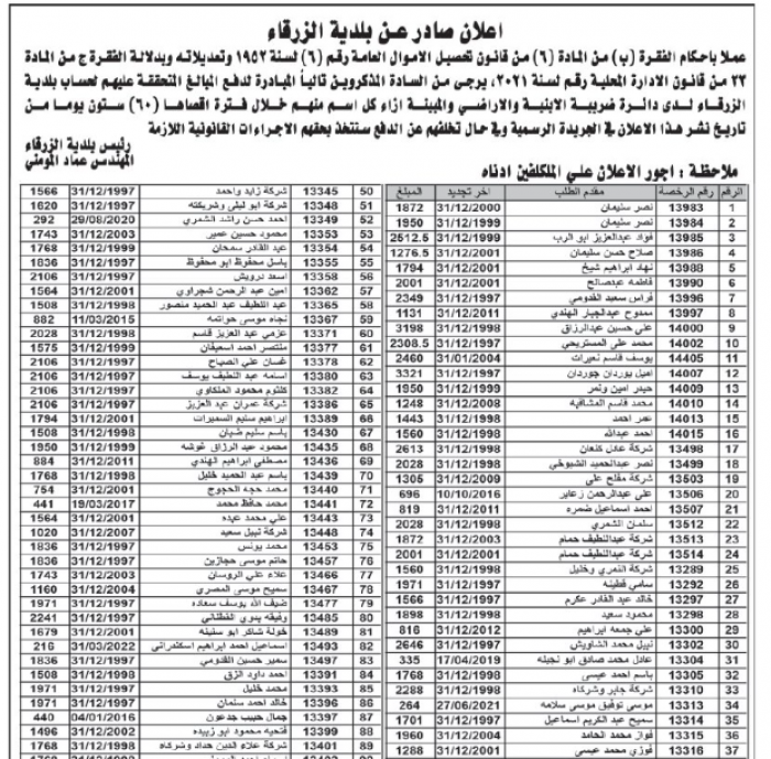 بلدية الزرقاء تنشر أسماء مواطنين ترتبت عليهم مبالغ مالية