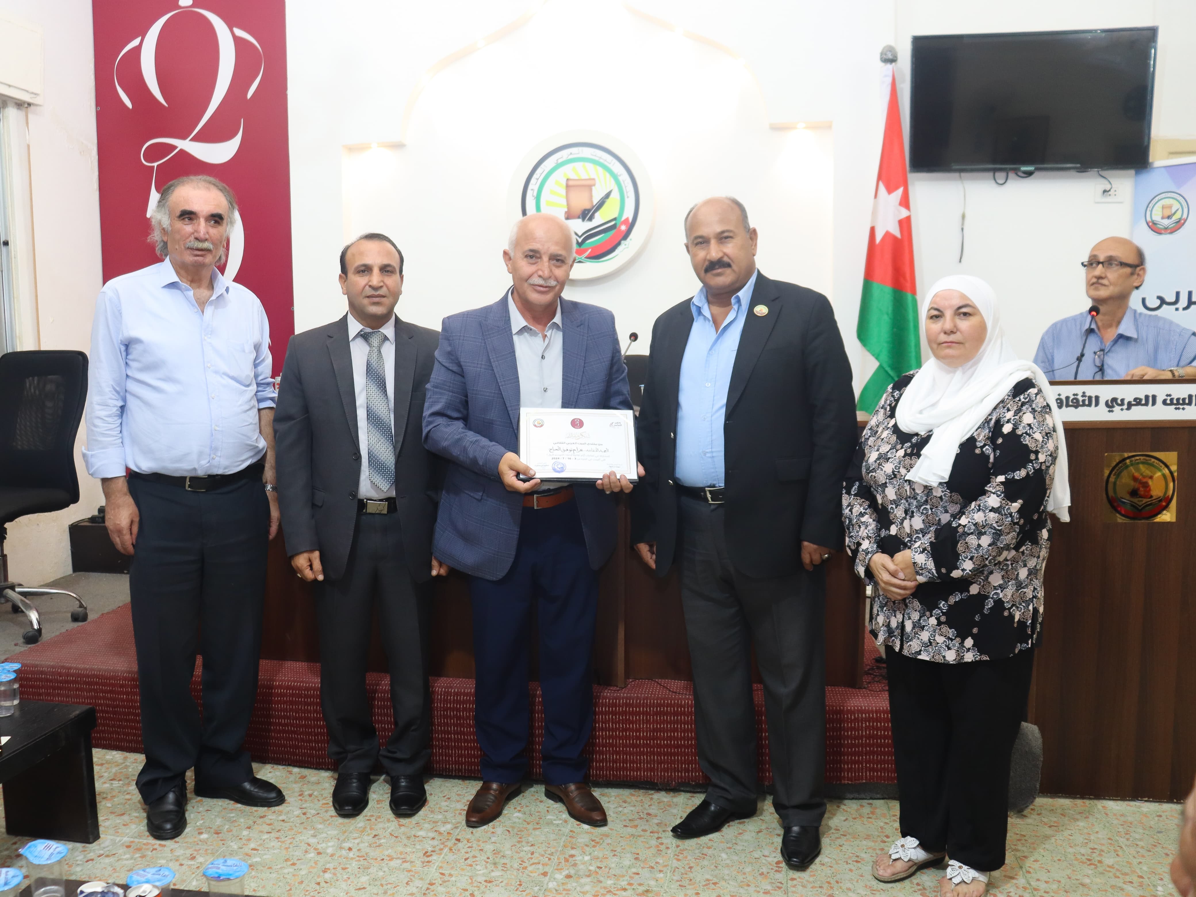 أيام ثقافية أردنية التي ينظمها منتدى البيت العربي الثقافي تواصل فعالياتها بمناسبة اليوبيل الفضي لتولي جلالة الملك عبد الله الثاني ابن الحسين سلطاته الدستورية، وذلك بإحياء الأمسية الثامنة من أيام المهرجان شارك فيها منتدى زوايا للثقافة والفنون من مدينة السلط،حيث بدأ البرنامج الذي أدارته سمر أبو رمان بالسلام الملكي ثم بعرض فيلم يتحدث عن فعاليات منتدى زوايا أعده الفنان التشكيلي ابراهيم ملكاوي ثم قدّم رئيس منتدى زوايا الشاعر خالد الخالدي كلمة قال فيها:يسرنا في منتدى زوايا للثقافة والفنون الذي يعمل تحت مظلة مديرية ثقافة البلقاء أن نرحب بكم في هذا اليوم الثقافي للاحتفال بأعياد الوطن وخاصة اليوبيل الفضي لجلوس سيدي جلالة الملك عبد الثاني على العرش.وإننا بكل ولاء وانتماء نتقدم من مقام صاحب الجلالة وسمو ولي عهده الأمين بأجمل التهاني والتبريكات، مجددين البيعة للهواشم الأحرار من آل المصطفى الأخيار.ونشكر وزارة الثقافة على رعايتها هذه الأيام الثقافية ممثلة بالوزيرة السيدة هيفاء النجاروالشكر موصول لمنتدى البيت العربي الثقافي ممثلا برئيسه المهندس الشاعر صالح الجعافرة وأمينة السر الأديبة ميرنا حتقوةو الشكر لكم أيها الحضور الأفاضل على قدومكم الكريمإذا استعرضنا إنجازات اليوبيل الفضي لأبي الحسين سيطول الحديث عن نهضة صناعية متقدمة ومكانة حضارية مرموقة وجاهزية قتالية دفاعية عالية لقواتنا المسلحة، وكفاءة واقتدار أجهزتنا الأمنية الساهرة، إنجازات نرفع بها الهامة فخرا واعتزاز ونستظل بأفيائها أمنا وأمانا.أعدكم بمساء يتجلى فيه الشعر ويتغنى فيه اللحن،وبدوره ألقى العميد المتقاعد عزام توفيق الحاج المحاضر في العلوم العسكرية كلمة بهذه المناسبة السعيدة العزيزة على قلوب كل الأردنيين مشيرا الى الانجازات الملكية خلال هذه الفترة.واكد على دور القوات المسلحة الأردنية في حماية الحدود من المخاطر التي تحاك ضد الوطن ثم قدم القاص عبد الكريم الجالودي عددا من قصصه التي تحاكي الزمان والمكان وتتحدث عن المناسبة وتخلل الامسية فقرة شعرية لكل من الشاعر راكان المساعيد والشاعرة إيمان زيادة بقراءة مجموعة من القصائد الوطنية الوجدانية، بعد ذلك قدّم الأديب والفنان عماد المقدادي عملين من ألحانه على طريقة (البانوراما فيديو لايف) بمرافقة الموسيقى والصورة من شاشة العرض وأداء حي ، إحداهما كانت عن الأردن والاحتفالات الوطنية بعنوان (ديرة هلي ) وآخرى حول معاناة المرأة الغزّية تحمل عنوان (التهمة أني غزيّة) ويذكر أن العملين من كلمات الشاعر راكان المساعيد .وفي الختام قدّم المهندس صالح الجعافرة رئيس منتدى البيت العربي الثقافي درعاً تكريميا لرئيس منتدى زوايا للثقافة والفنون و شهادات تقديريه للمشاركين .