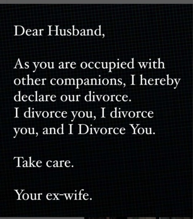وجاء في منشور على حساب الشيخة مهرة البالغة من العمر 30 عاما، الأربعاء: "عزيزي زوجي... بينما أنت مشغول برفاق آخرين. أُعلن طلاقنا: أُطلقك... أُطلقك... وأطلقك! اعتني بنفسك... زوجتك السابقة".