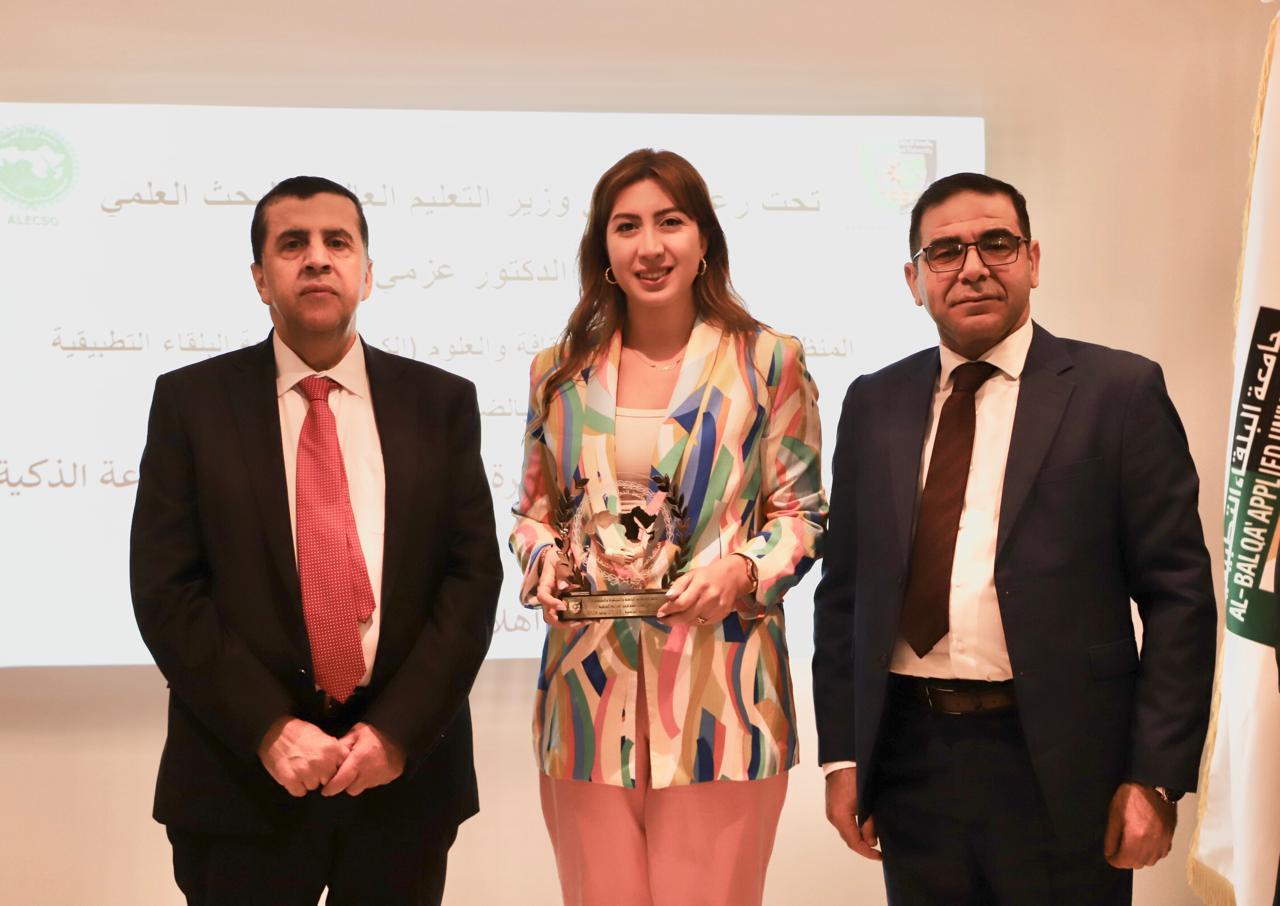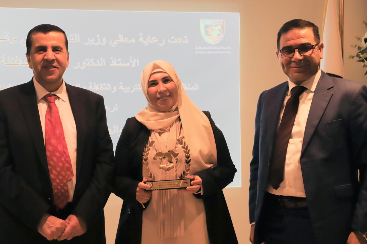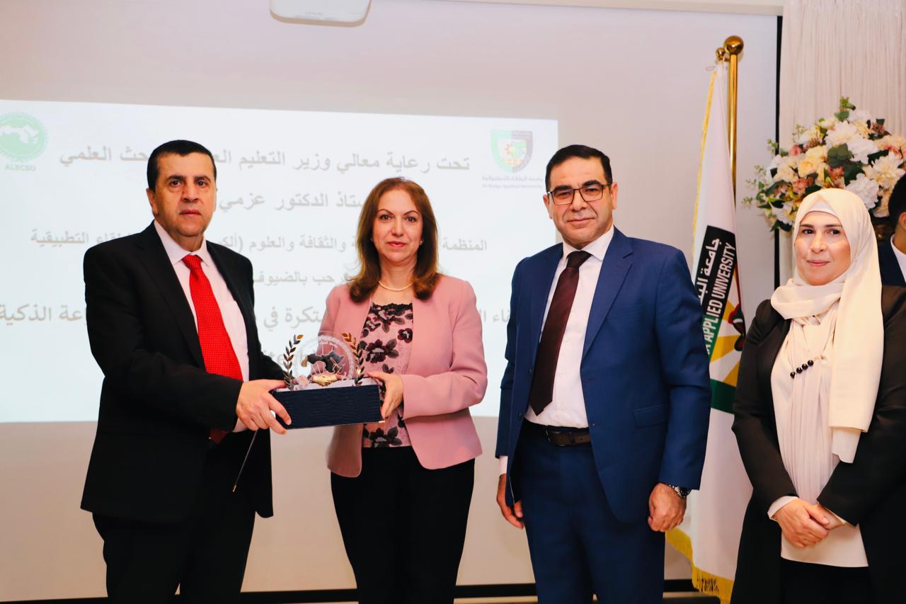 الاستاذ الدكتور محمد سند ابو درويش مدير ادارة العلوم والبحث العلمي في المنظمة العربية للتربية والثقافة والعلوم، والسيدة ابتسام ايوب امين سر اللجنة الوطنية للتربية والثقافة والعلوم، والاستاذة الدكتورة امل العبادي عميد كلية الزراعة التكنولوجية، والأستاذ الدكتور صفوان الشياب عميد شؤون الطلبة في الجامعة الأردنية،