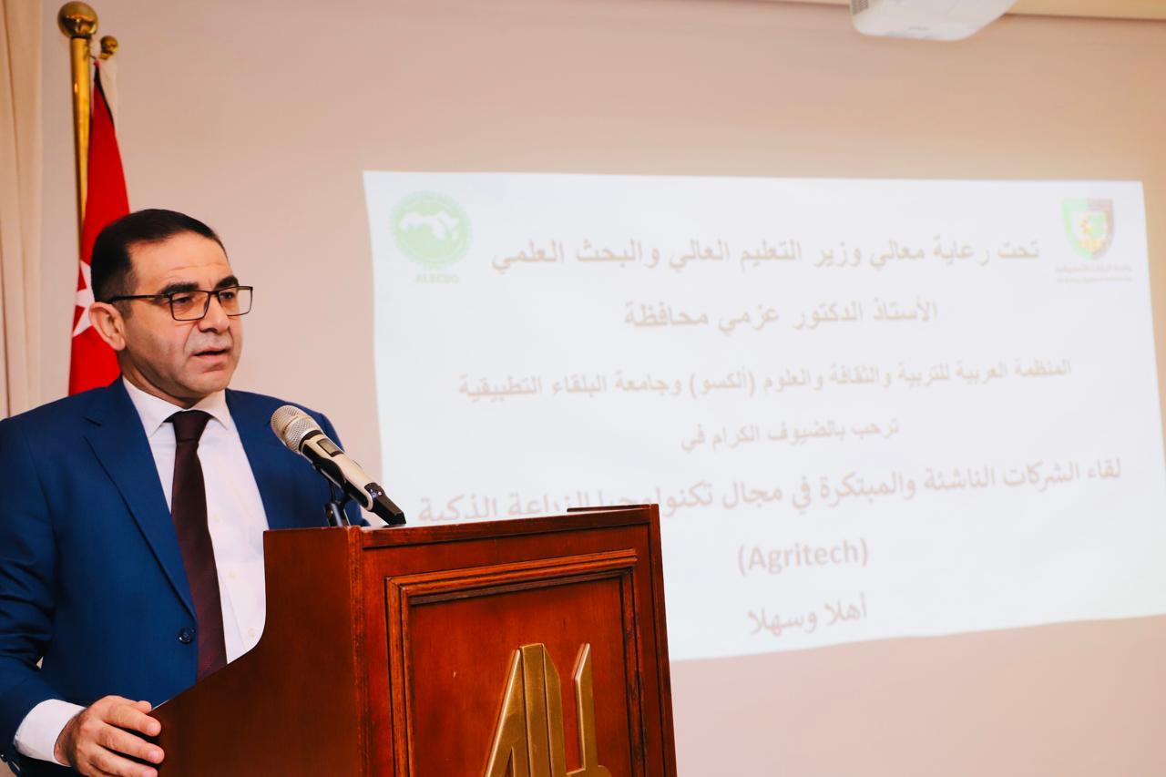 مندوبا عن وزير التعليم العالي والبحث العلمي الاستاذ الدكتور عزمي محافظة رعى رئيس جامعة البلقاء التطبيقية الأستاذ الدكتور احمد فخري العجلوني فعاليات ( ملتقى الشركات الناشئة والمبتكرة في مجال تكنولوجيا الزراعة الذكية ( Agritech ) والذي أقامته كلية الزراعة التكنولوجية في الجامعة وبالتعاون مع المنظمة العربية للتربية والثقافة والعلوم ( الالكسو) .
