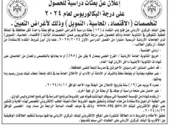 أعلن البنك المركزي الأردني اليوم الأحد، عن فتح باب التقدم لـ 12 بعثة دراسية بواقع بعثة واحدة لكل محافظة في المملكة للطلبة المتفوقين في الثانوية العامة، وذلك للحصول على درجة البكالوريوس ضمن التخصصات التالية:( الاقتصاد، والمحاسبة، والتمويل)، لدى الجامعات الأردنية الرسمية اعتبارا من الفصل الدراسي الأول 2024/2025 .
