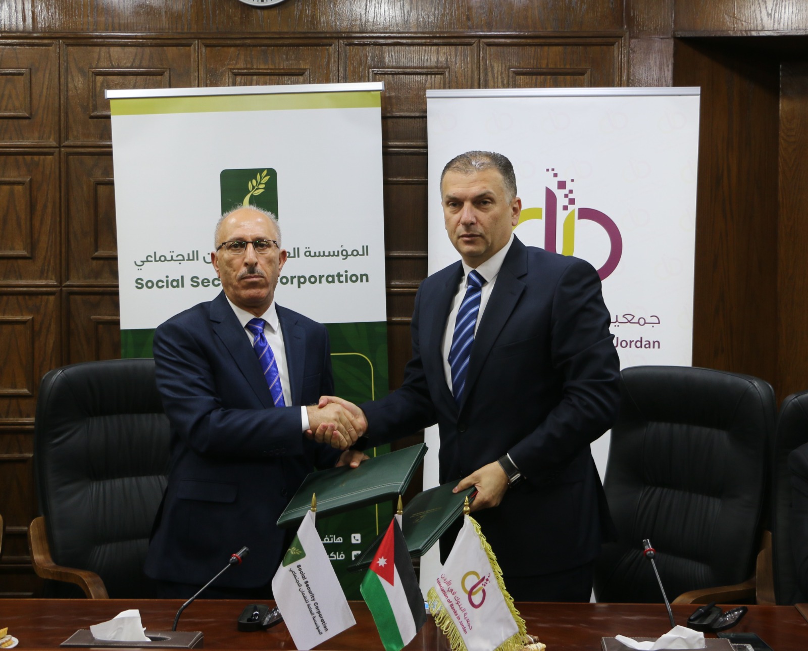 وقعت المؤسسة العامة للضمان الاجتماعي وجمعية البنوك في الأردن مذكرة تفاهم تهدف إلى تعزيز التعاون المشترك بين الطرفين ورفع مستوى الخدمات المقدمة للجمهور وتقديم الخدمات للمؤمن عليهم والحاصلين على رواتب تقاعدية ومستحقيها بموجب قانون الضمان، والحد من تعثر المتقاعدين والمستحقين بتسديد الالتزامات الشهرية المترتبة عليهم للبنوك، وذلك في مقر الإدارة العامة للمؤسسة.