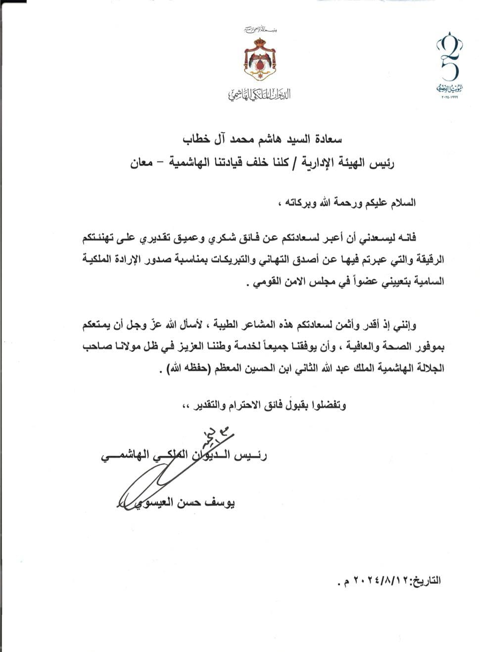 وجه رئيس الديوان الملكي الهاشمي العامر يوسف حسن العيسوي رسالة شكر وتقدير إلى رئيس الهيئة الإدارية لفريق كلنا خلف قيادتنا الهاشمية السيد هاشم محمد آل خطاب، وذلك على التهاني الطيبة المقدمة له بمناسبة صدور الإرادة الملكية السامية بتعينه عضواً في مجلس الامن القومي. وكرم العيسوي آل خطاب برسالةٍ، جاء فيها : سعادة السيد هاشم محمد آل خطاب رئيس الهيئة الإدارية / كلنا خلف قيادتنا الهاشمية— معانالسلام عليكم ورحمة الله وبركاته،فانه ليسعدني أن أعبر لسعادتكم عن فائق شكري و عميق تقديري على تهنئتكم الرقيقة والتي عبرتم فيها عن أصدق التهاني والتبريكات بمناسبة صدور الإرادة الملكية السامية بتعيني عضواً في مجلس الامن القومي.وإنني إذ أقدر وأثمن لسعادتكم هذه المشاعر الطيبة، لأسل الله عزّ وجل أن يمتعكم بموفور الصحة والعافية ، وأن يوفقنا جميعاً لخدمة وطننا العزيز في ظل مولانا صاحب الجلالة الهاشمية الملك عبد الله الثاني ابن الحسين المعظم (حفظه الله). وتفضلوا بقبول فائق الاحترام والتقدير،،#الديوان_الملكي_الهاشمي #كلنا_خلف_قيادتنا_الهاشمية