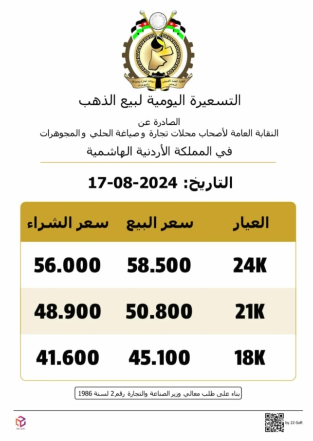 وصل سعر غرام الذهب عيار 21 في السوق المحلية إلى 50.8 دينارا بحسب ما ذكرته التسعيرة الصادرة عن النقابة العامة لأصحاب محلات تجارة وصياغة الحلي والمجوهرات اليوم السبت.وتاليا نص التسعيرة كاملة: