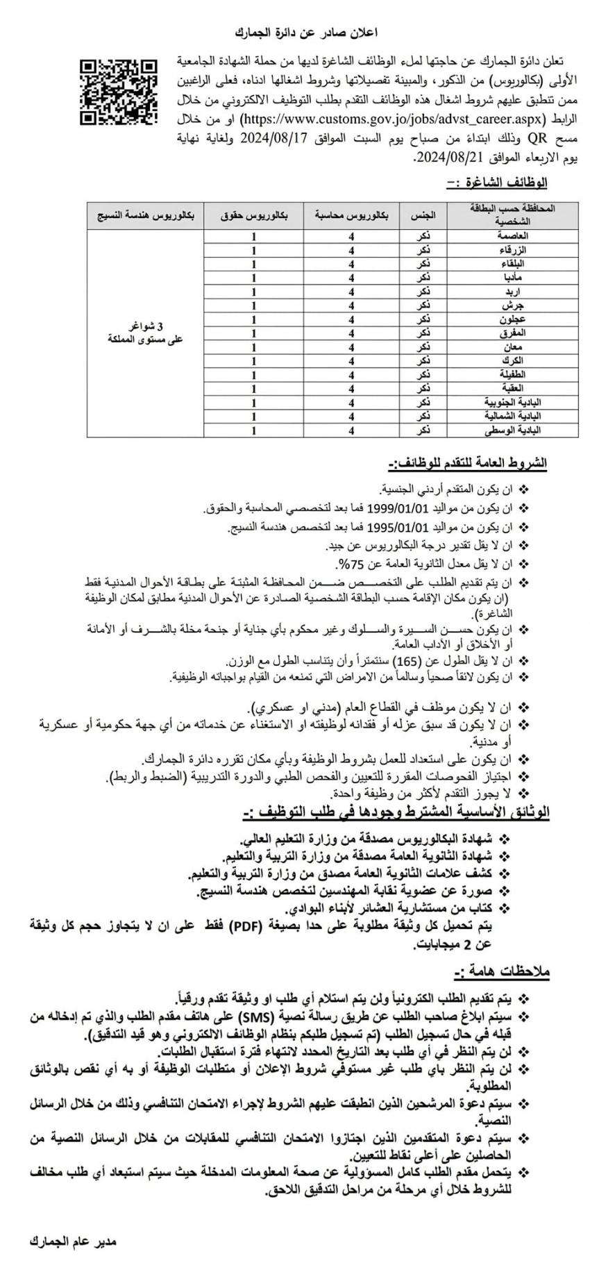 أعلنت دائرة الجمارك الاردنية عن وظائف شاغرة لديها في تخصصات بكالوريوس محاسبة وبكالوريوس حقوق وبكالوريوس هندسة النسيج (ذكور فقط ).