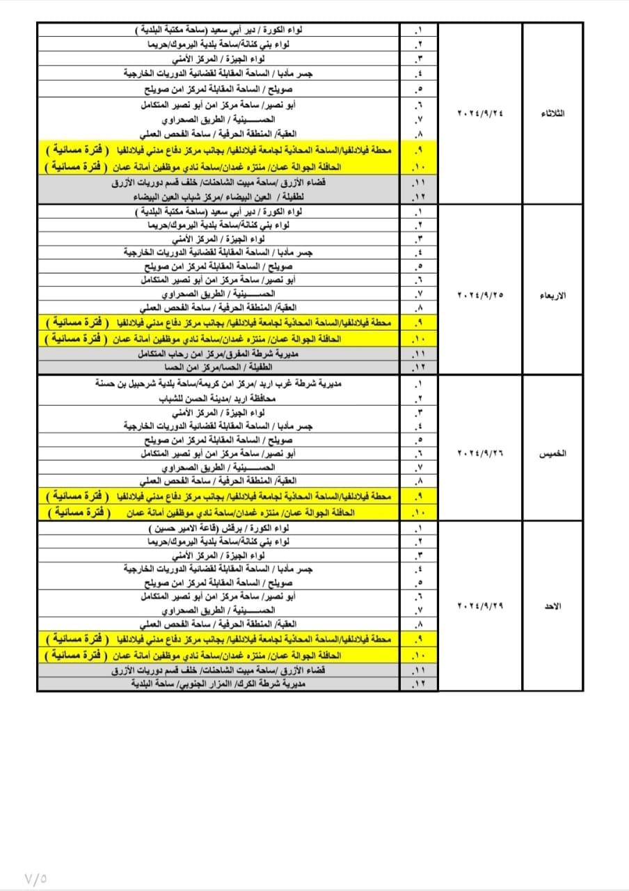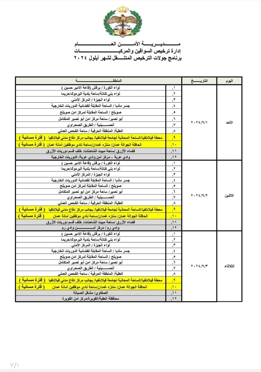 أعلنت إدارة ترخيص السواقين والمركبات عن مواعيد العمل بجولات الترخيص المتنقل ضمن المبادرة الابتكارية (بنوصلك) خلال شهر أيلول لعام 2024 في عدد من مناطق المملكة. وأوضحت مديرية الأمن العام أن ساعات الدوام للترخيص المتنقل ستكون من يوم الأحد ولغاية يوم الأربعاء من الساعة الـ8 صباحاً وحتى الساعة الـ2 ظهراً، ويوم الخميس من الساعة الـ8 صباحاً ولغاية الساعة الـ1 ظهراً.