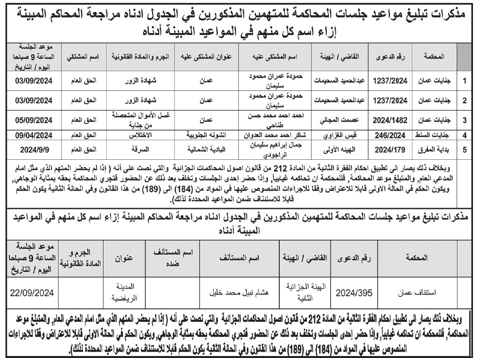 نشرت محاكم أردنية عبر الصحف اليومية الصادرة اليوم الاثنين، مذكرات تبليغ بمواعيد جلسات المحاكمة لمشتكى عليهم ولمتهمين ولأظناء وقرارات امهال. وطلبت المذكرات من المذكورين في الجداول أدناه مراجعة المحاكم المبينة إزاء اسم كل منهم في المواعيد المبينة أدناه. وتاليا التفاصيل والأسماء: