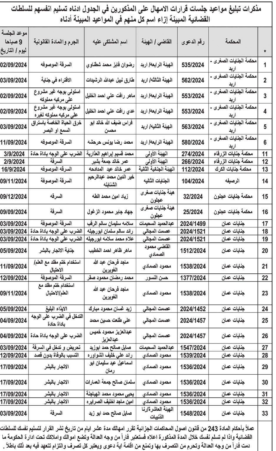 محاكم تنشر مذكرات تبليغ لأردنيين بمواعيد جلسات (أسماء)