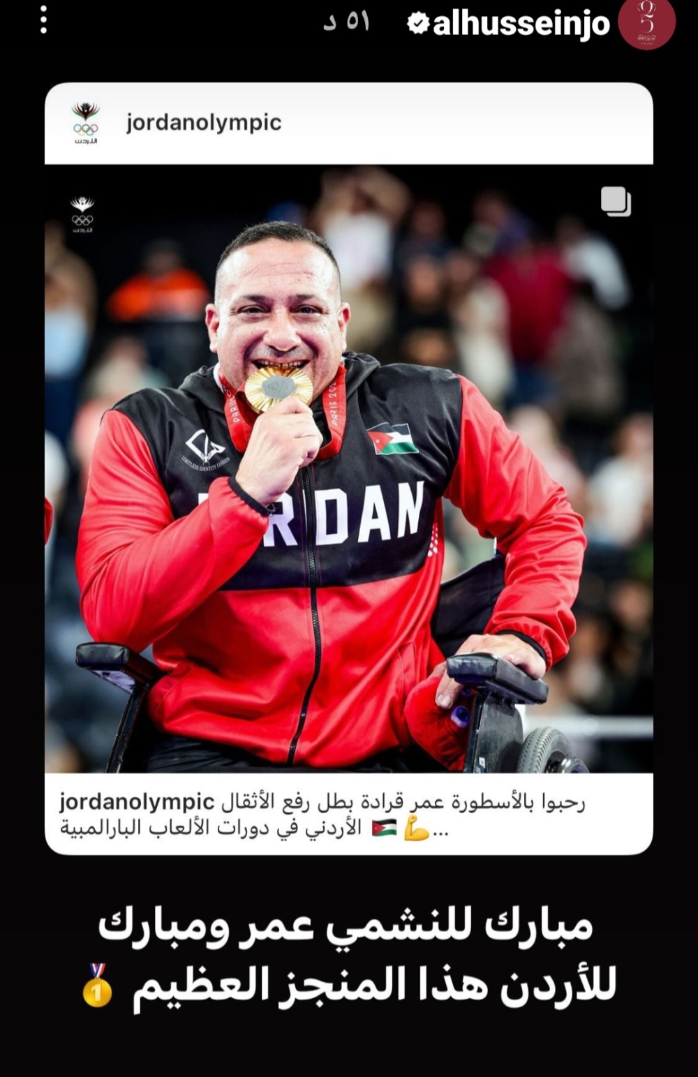 هنأ الامير الحسين بن عبدالله الثاني ولي العهد البطل عمر قرادة للتتويجه بأولى ميدالية ذهبية أردنية في دورة الألعاب البارالمبية "باريس 2024". ونشر ولي العهد على صفحته انستغرام على خاصية الستوري صورة لقرادة وكتب: “ مبروك للنشمي عمر ومبروك للأردن هذا الانجاز”
