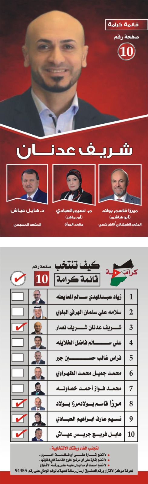 أبناء محافظة الزرقاء الأبية الأهل والعزوه والعشيرة يتقدم مجلس عشائر جبل الخليل في الأردن بتقديم تحية الاخلاص والوفاء لشعبنا الاردني وقيادته الهاشمية الحكيمة .وأننا نتطلع إليكم اليوم بدعمكم لمرشح إجماع مجلس عشائر جبل الخليل سعادة الأخ شريف عدنان ودعم ومؤازرة الكوتات الانتخابية لقائمة كرامة التي يمثل المرشح الاستاذ شريف عدنان فيها مجلس عشائر جبل الخليل وهم أصحاب السعادة : ١.سعادة المهندسة نسيم العبادي - مقعد المرأة ٢.سعادة الدكتور هايل عياش ـ المقعد المسيحي ٣. سعادة الأستاذ ميرزا بولاد ـ المقعد الشيشاني والشركسي. معاهدين الله لهذا الوطن عهد قيادته الهاشمية الحكيمة لأبناء شعبه بأن يظل عزيزا كريما آمنا مطمئنا مستقرا .ـ رئيس مجلس عشائر جبل الخليل .سعادة ا. مجاهد صبري طنينه الهيئة الاستشارية العليا لمجلس عشائر جبل الخليل ـ اللجنة الانتخابية المركزية العليا لمجلس عشائر جبل الخليل/ محافظة الزرقاء الخميس ٥/ ٩/ ٢٠٢٤