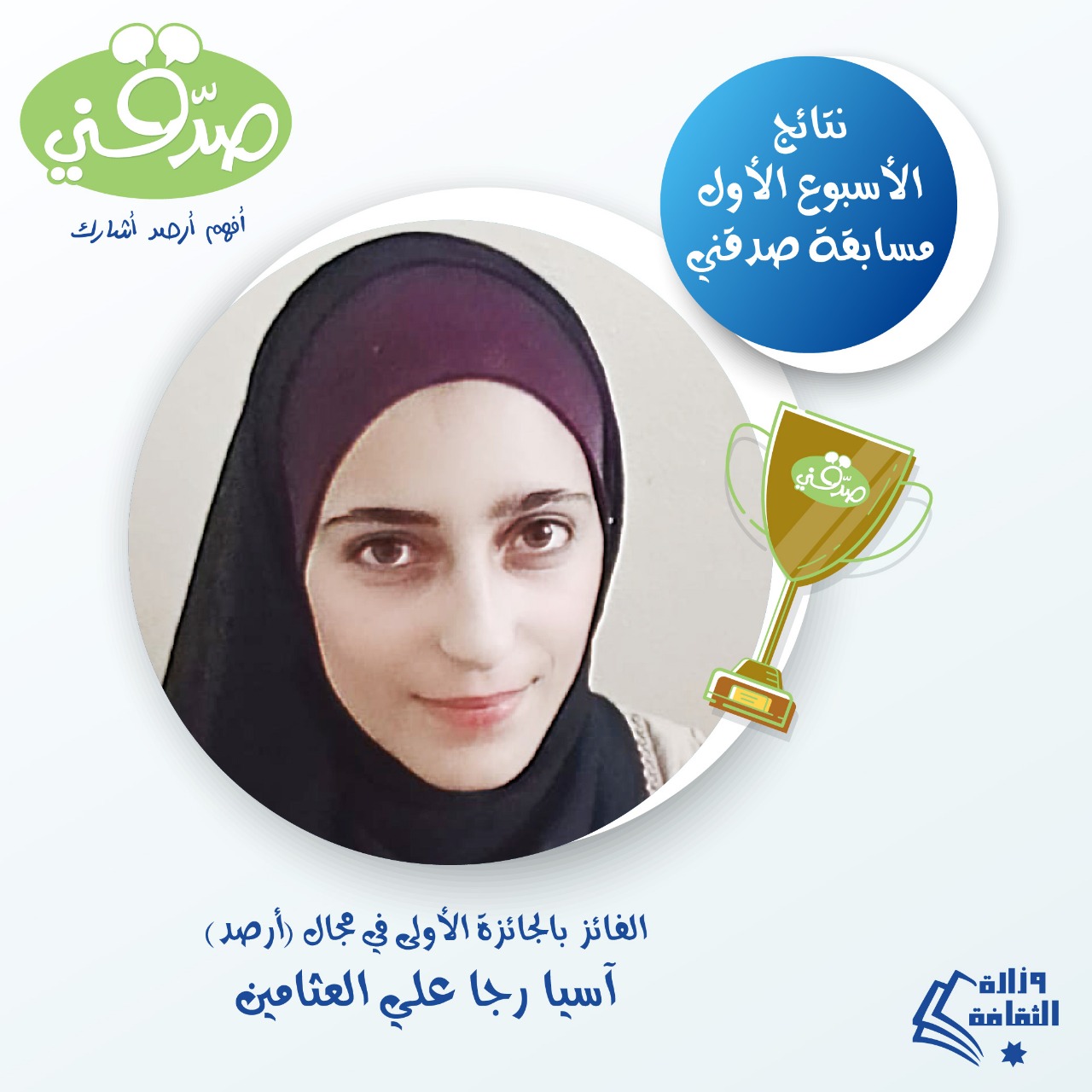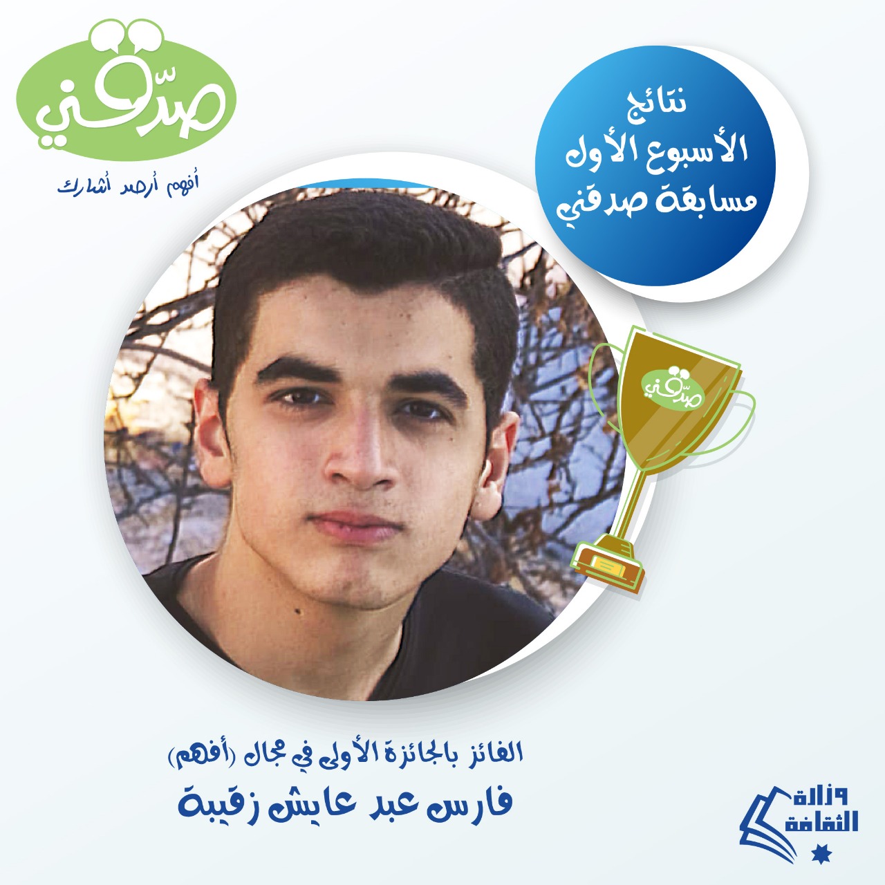 وفاز بالمراكز الأولى في الفئات المشار إليها، المتسابق أنس عبدالله حسن عدس عن فئة “أشارك الفيديو”، والمتسابقة رغد منذر محمد الداودية، عن فئة “أشارك مقالة”، والمتسابق فارس عبد عايش زقيبة عن فئة “أفهم”، والمتسابقة آسيا رجاء علي العثامين عن فئة “أرصد”.