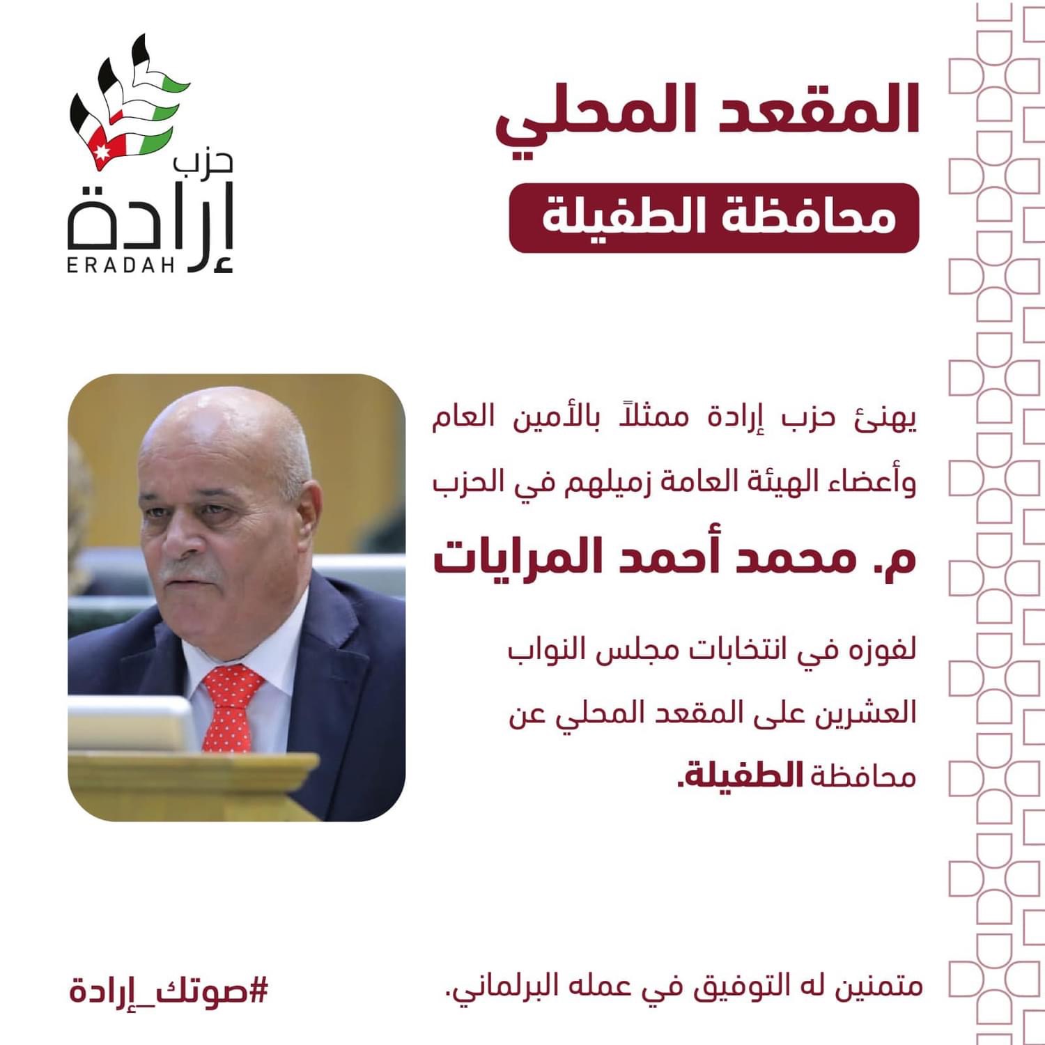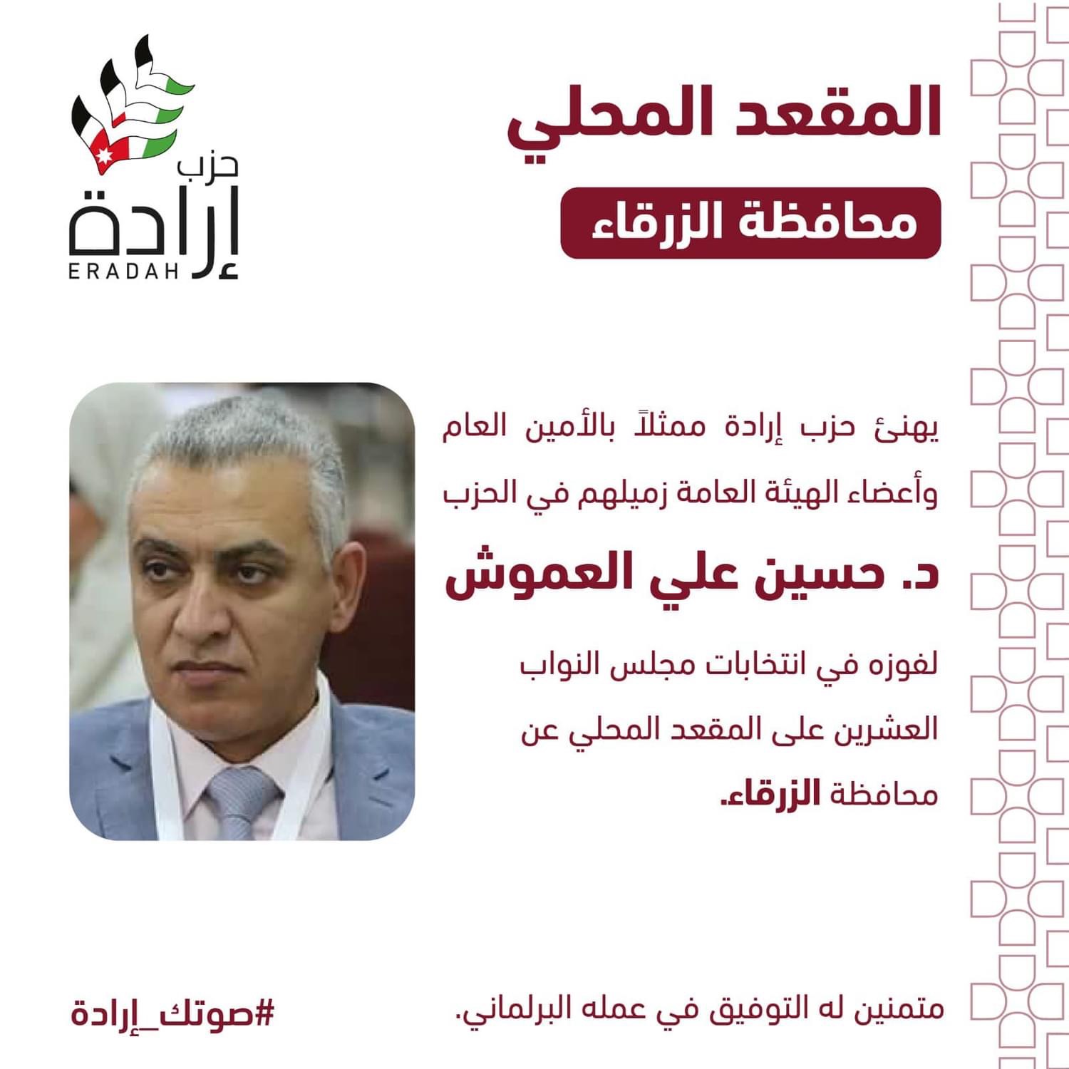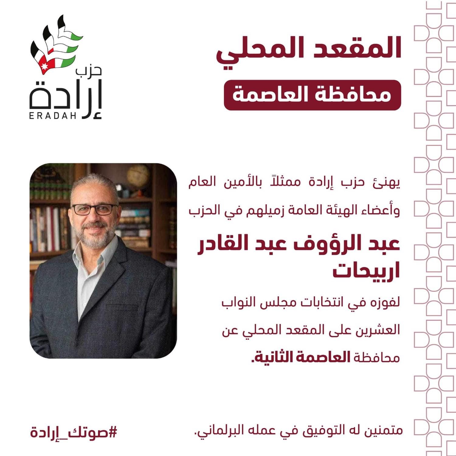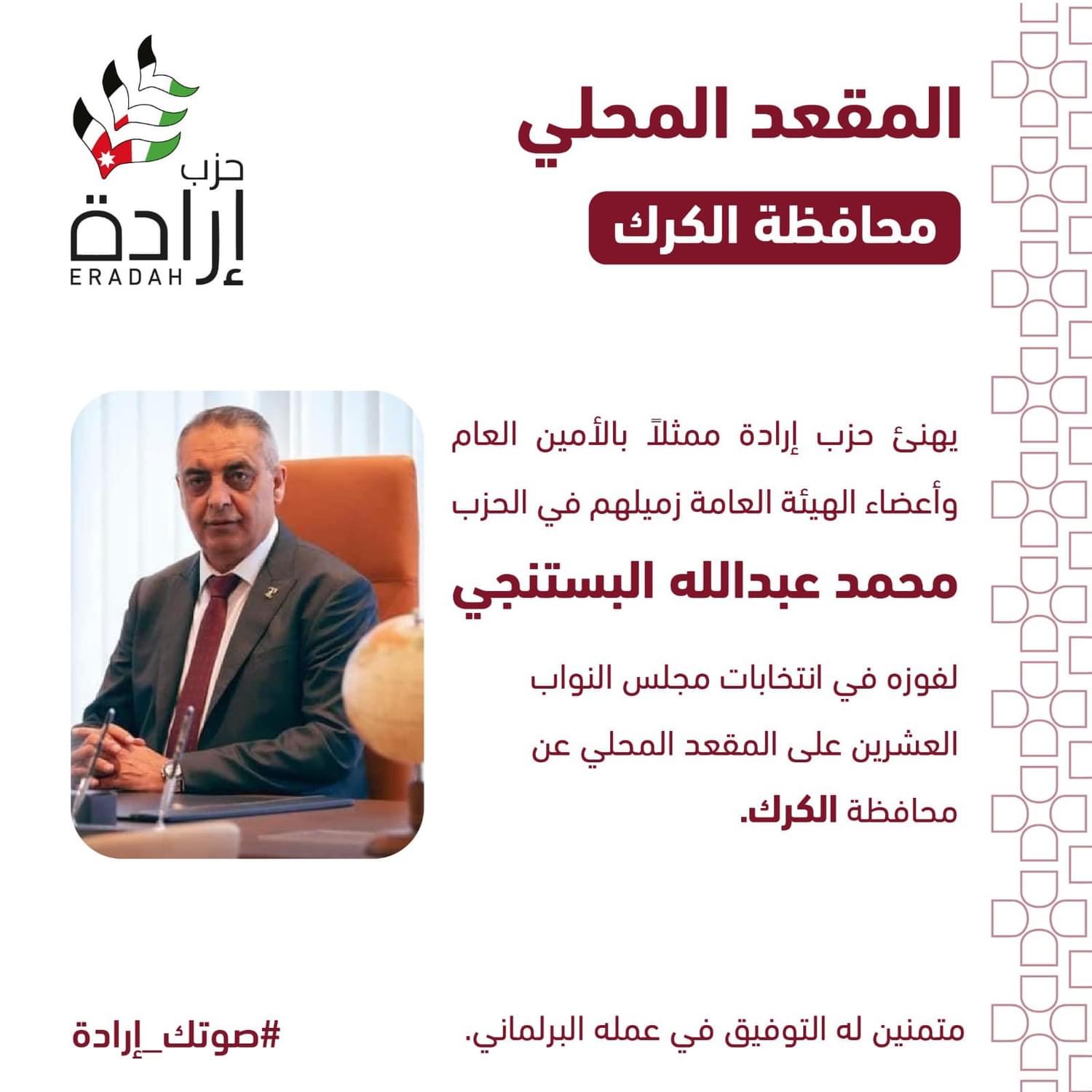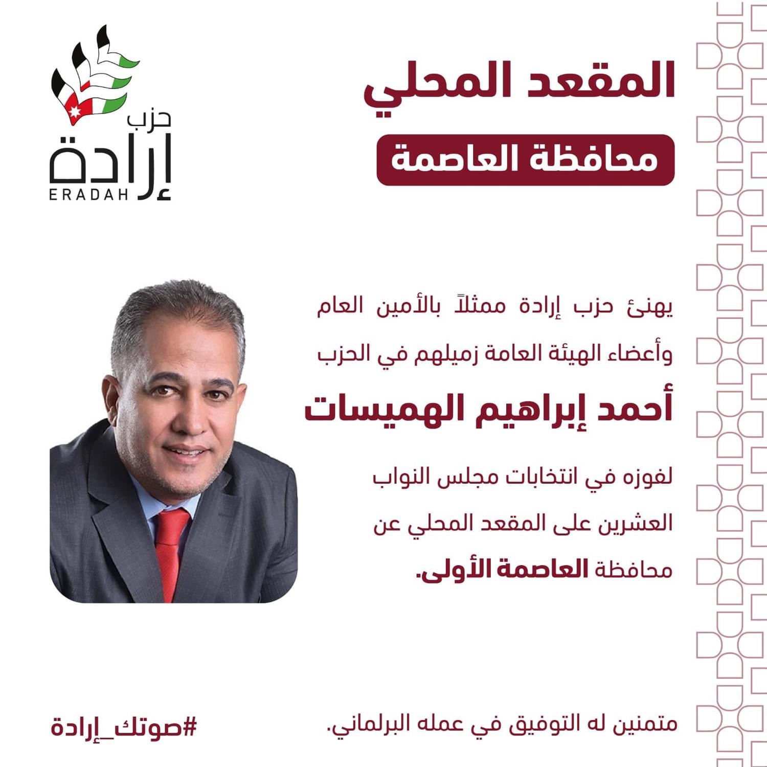 ويعد ذلك - وبالرغم من كل شيء- ثمرةً للجهود الكبيرة التي بذلها الحزب أعضاءا ومناصرين، وهو شهادةً على ثقة الشعب الأردني في رؤيتنا وأهدافنا و برنامج الحزب الذي يتطلّع إلى بناء مستقبل أفضل يليق بكل أردني وأردنية.، وفي هذا السياق، نتوجه في حزب إرادة ببالغ الشكر والتقدير للهيئة العامة وجميع من دعم وناصر الحزب، الذي جاء بناءاً على قناعة بأن الديمقراطية الأردنية هي مسارٌ لا رجعة فيه نحو ترسيخ دولة القانون والمؤسسات.