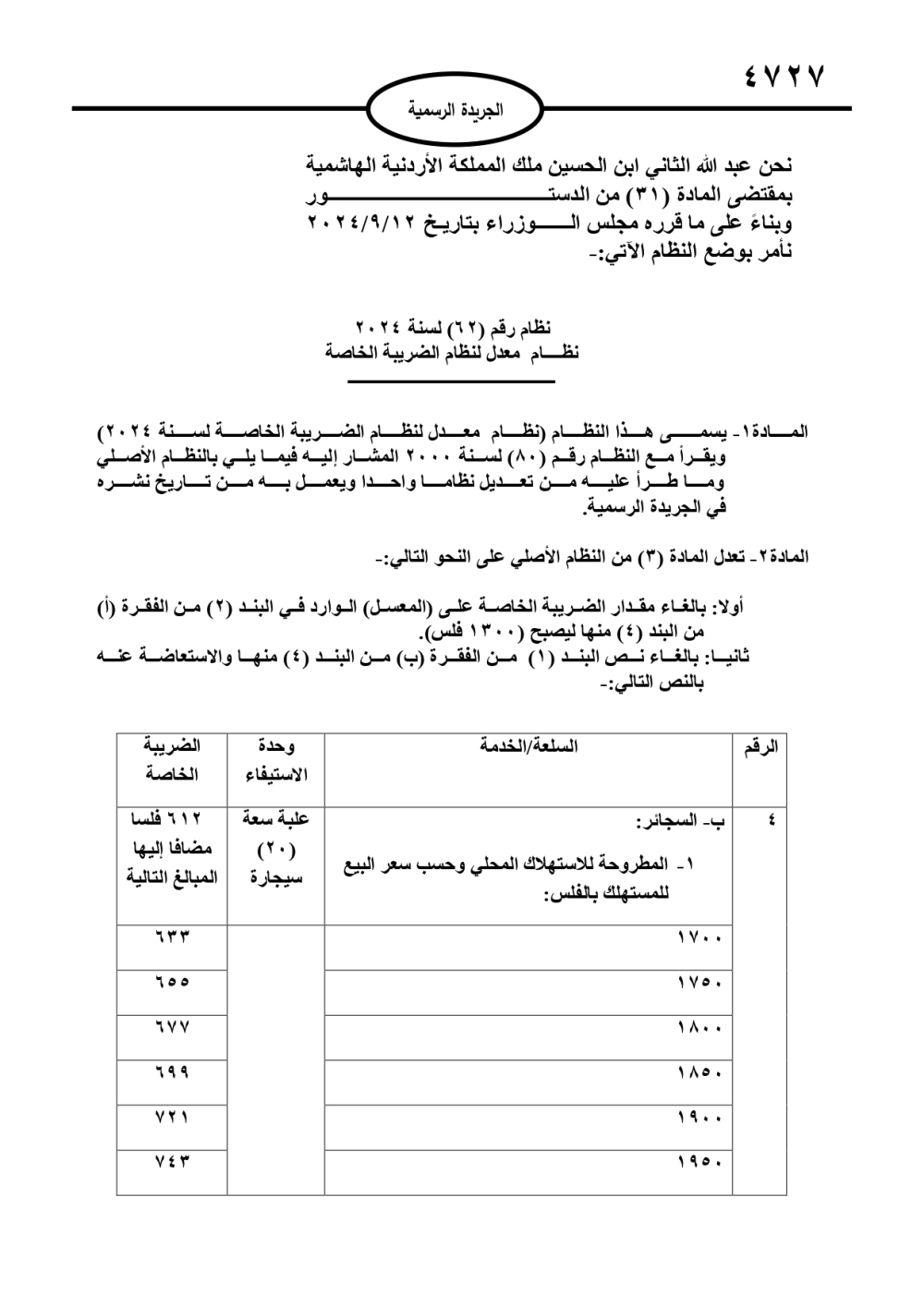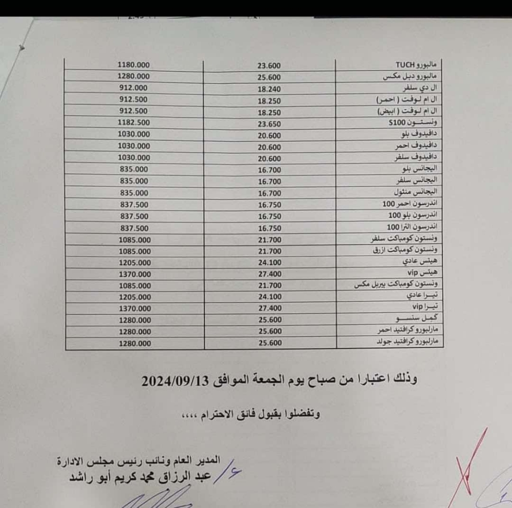 نُشرت القائمة الجديدة لأسعار الدخان بعد القرار الحكومي برفع الضريبة الخاصة المفروضة على السجائر والتبغ.
