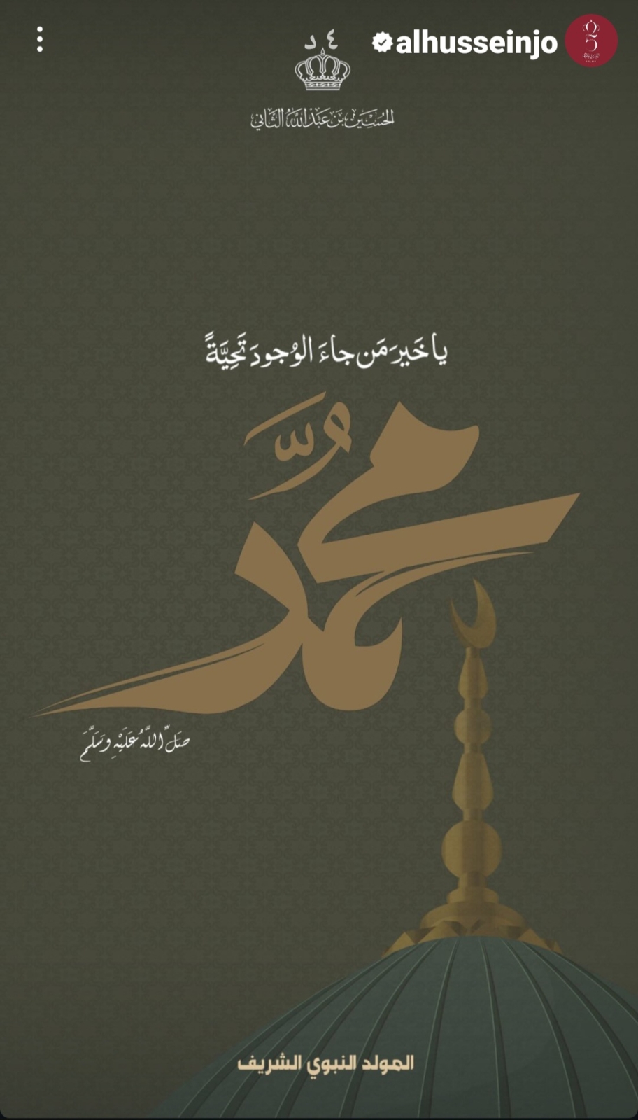 هنأ الأمير الحسين بن عبدالله الثاني ولي العهد بمناسبة المولد النبوي الشريف. ونشر ولي العهد على صفحته انستغرام بطاقة تهنئة بعيد المولد النبوي.