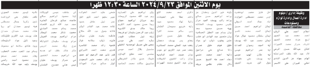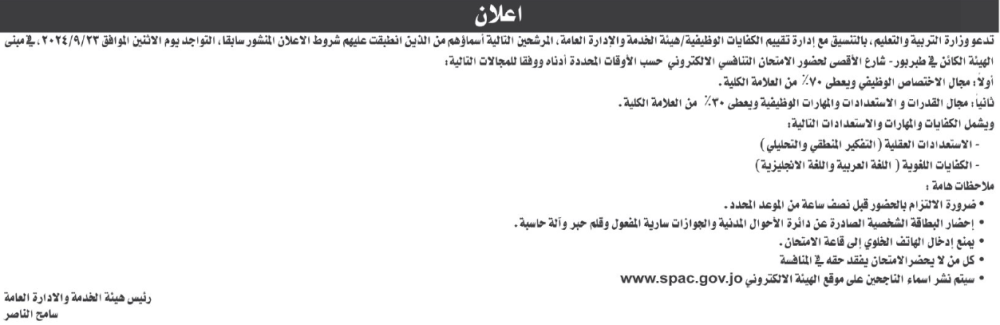دعت وزارة التربية والتعليم، يوم الأربعاء، بالتنسيق مع إدارة تقييم الكفايات الوظيفية في هيئة الخدمة والإدارة العامة، مجموعة من المرشحين لحضور الامتحان التنافسي.