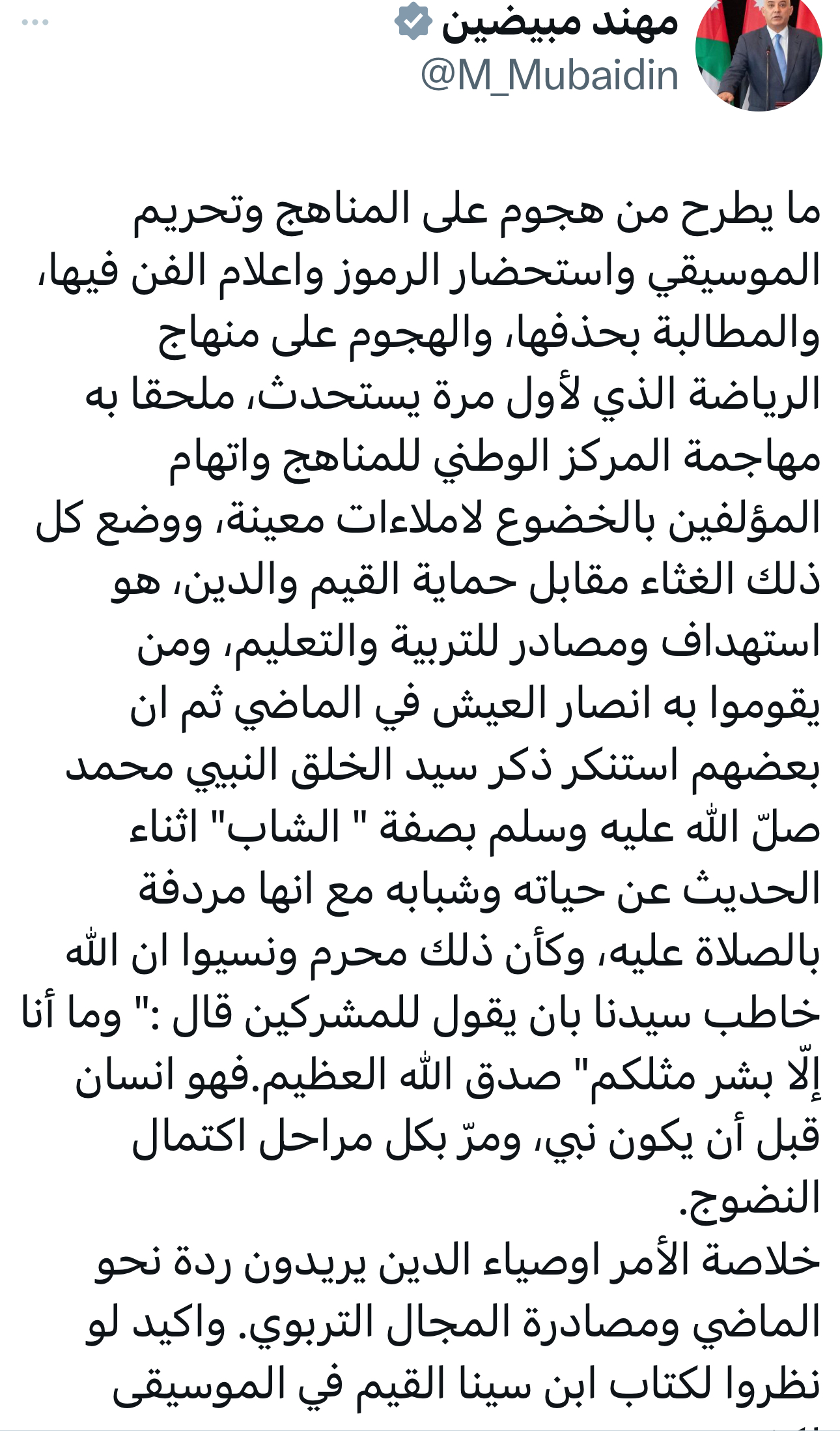 قال الدكتور مهند مبيضين وزير الاتصال الحكومي السابق في ادراج له عبر x :- ما يطرح من هجوم على المناهج وتحريم الموسيقي واستحضار الرموز واعلام الفن فيها، والمطالبة بحذفها، والهجوم على منهاج الرياضة الذي لأول مرة يستحدث، ملحقا به مهاجمة المركز الوطني للمناهج واتهام المؤلفين بالخضوع لاملاءات معينة، ووضع كل ذلك الغثاء مقابل حماية القيم والدين، هو استهداف ومصادر للتربية والتعليم، ومن يقوموا به انصار العيش في الماضي ثم ان بعضهم استنكر ذكر سيد الخلق النبيي محمد صلّ الله عليه وسلم بصفة " الشاب" اثناء الحديث عن حياته وشبابه مع انها مردفة بالصلاة عليه، وكأن ذلك محرم ونسيوا ان الله خاطب سيدنا بان يقول للمشركين قال :" وما أنا إلّا بشر مثلكم" صدق الله العظيم.فهو انسان قبل أن يكون نبي، ومرّ بكل مراحل اكتمال النضوج.