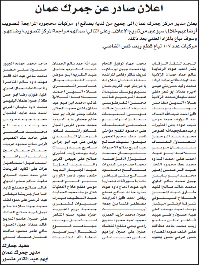 دعا مركز جمرك عمان اليوم الأحد، من لديهم بضائع او مركبات محجوزة لدى المركز، ضرورة مراجعته لتصويب أوضاعهم. وأوضح المركز، أن المدة ستكون أسبوعين من تاريخ الإعلان في الصحف اليومية وإلا سيتم طرح البضاعة في المزاد العلني