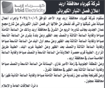 أما في منطقة الطيبة، وتحديداً غرب البلدة، طريق المزارع، وبالقرب من معصرة البلاونة، سيكون الانقطاع من الساعة التاسعة والنصف صباحاً وحتى الساعة الخامسة مساءً. وفي محافظة المفرق، ستتأثر المنطقة الجنوبية في زملة الأمير غازي والبستانة بانقطاع التيار من الساعة التاسعة والنصف صباحاً وحتى الساعة الثالثة عصراً. كما ستتأثر منطقة كفرنجة في محافظة عجلون، بالقرب من عين زغدية، بانقطاع التيار من الساعة الثامنة صباحاً وحتى الساعة الثانية ظهراً.