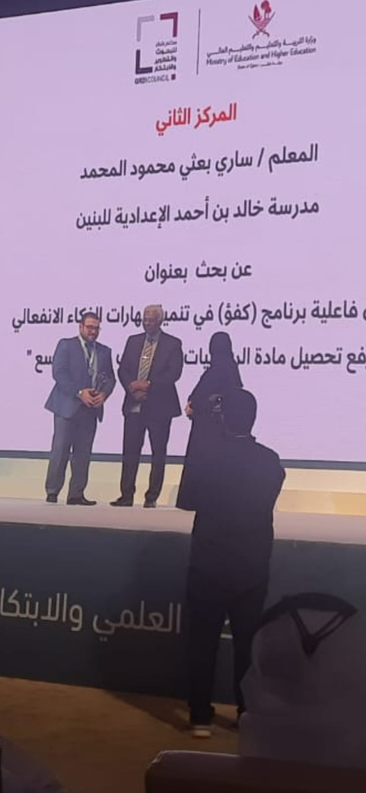 ضمن فعاليات الأسبوع السادس عشر للبحث العلمي والابتكار الذي تنظمه وزارة التربية والتعليم والتعليم العالي في قطر و بالشراكة مع مجلس قطر للبحوث والابتكار فقط تم تكريم الاستاذ ساري بعثي جرادات بالمدالية الفضية عن بحثه الموسوم ب فاعلية برنامج كفؤ في تنمية مهارات الذكاء الانفعالي ورفع تحصيل مادة الرياضيات لدى طلاب الصف التاسع ضمن فئة الأبحاث التربوية
