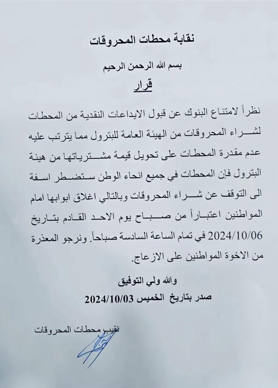 نفت هيئة تنظيم الطاقة صحة ورقة متداولة على أنها بالأردن، تفيد بإغلاق محطات المحروقات أبوابها أمام المواطنين ابتداء من صباح يوم غد الأحد. وقالت تحرير القاق الناطق الإعلامي باسم هيئة تنظيم قطاع الطاقة، إن هذا القرار ليس في الاردن، دون أن تحدد مكانه. وتاليا نص الكتاب المتداول: