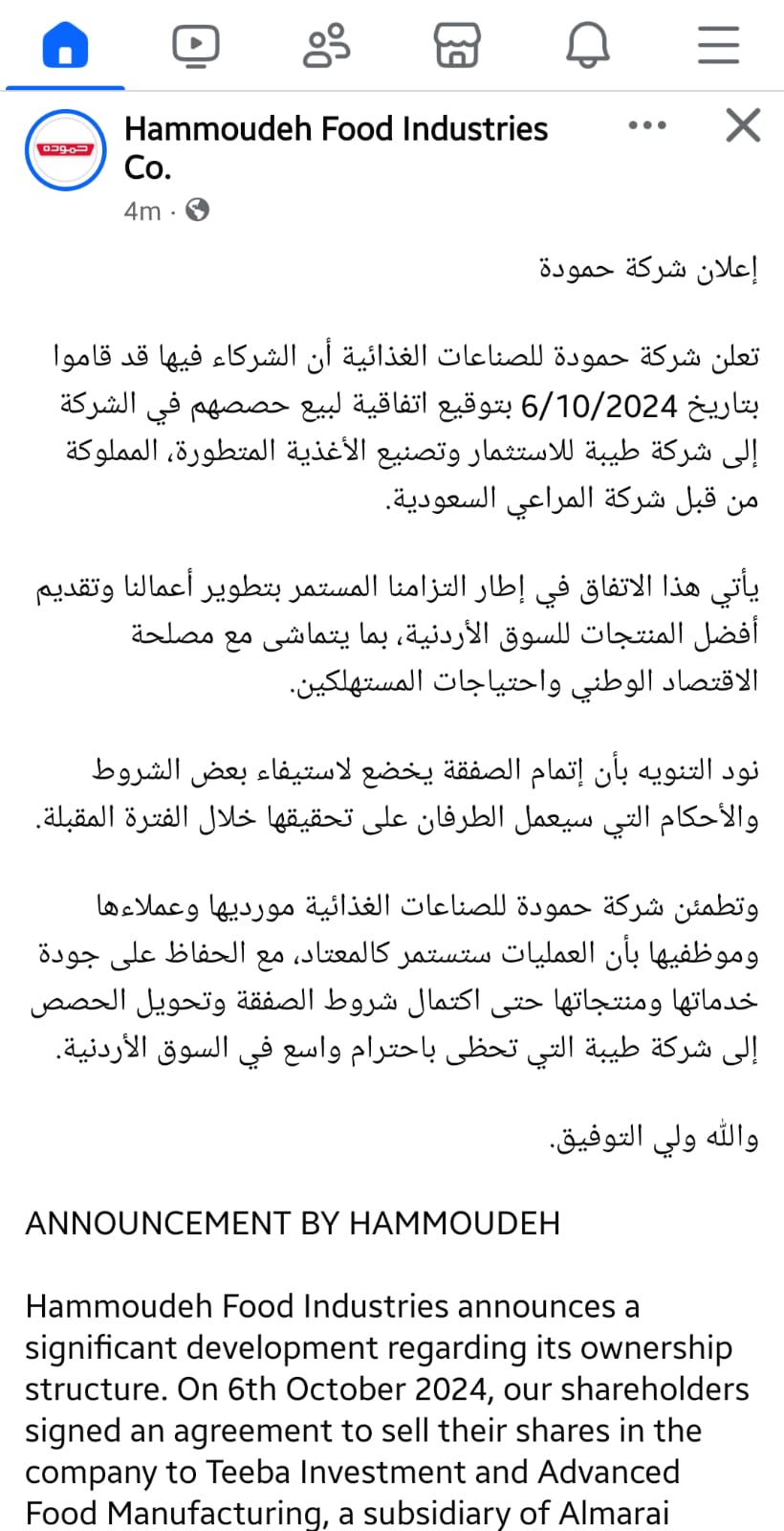 وقّعت شركة «المراعي» السعودية اتفاقية استحواذ من خلال شركة «طيبة للاستثمار والصناعات الغذائية المتطورة» التابعة لها على 100% من أسهم شركة «حمودة للصناعات الغذائية» الأردنية، وفقاً لإفصاح نُشر على موقع السوق السعودية «تداول» اليوم الاثنين.