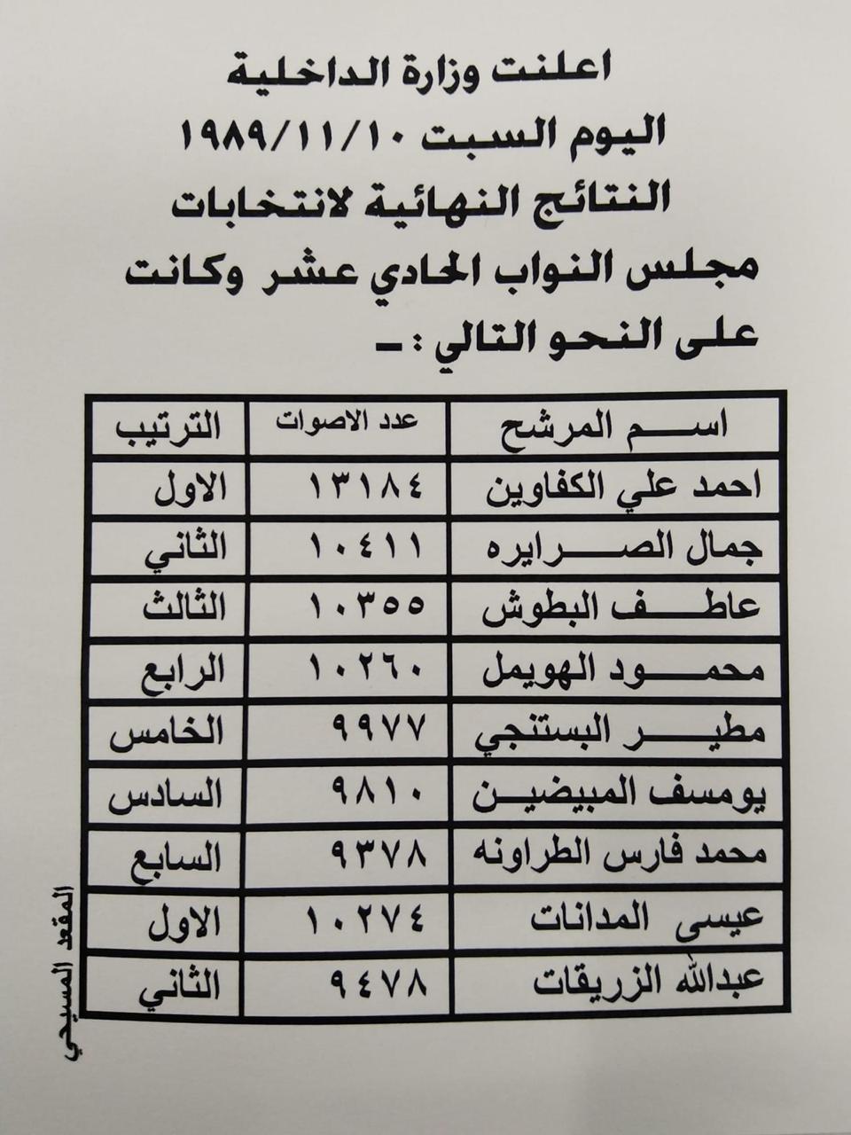 من الذاكرة : نتائج انتخابات مجلس النواب الحادي عشر بمحافظة الكرك .