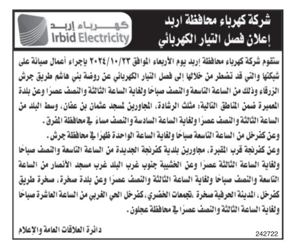 أعلنت شركة كهرباء إربد عن نيتها فصل التيار الكهربائي يوم الأربعاء المقبل عن عدة مناطق في ثلاث محافظات، وذلك لإجراء أعمال صيانة دورية على الشبكة الكهربائية. تأتي هذه الإجراءات في إطار حرص الشركة على تحسين جودة الخدمة وضمان استمرارية التيار الكهربائي بكفاءة عالية. وفيما يلي تفاصيل المناطق التي ستتأثر بانقطاع التيار الكهربائي ومدة الفصل: