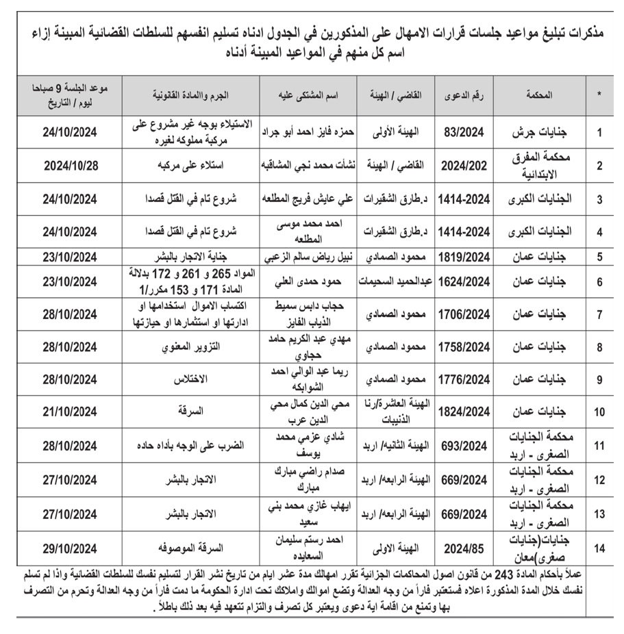 أُصدرت محاكم أردنية، اليوم الاثنين، مذكرات تبليغ بمواعيد جلسات محاكمة لعدد من المشتكى عليهم، ومتهمين، وأظناء، بالإضافة إلى قرارات إمهال. وتدعو هذه المذكرات الأشخاص المدرجين في الجداول التالية إلى مراجعة المحاكم المحددة أمام أسمائهم، وذلك في المواعيد المذكورة أدناه. وفيما يلي الأسماء والمواعيد:
