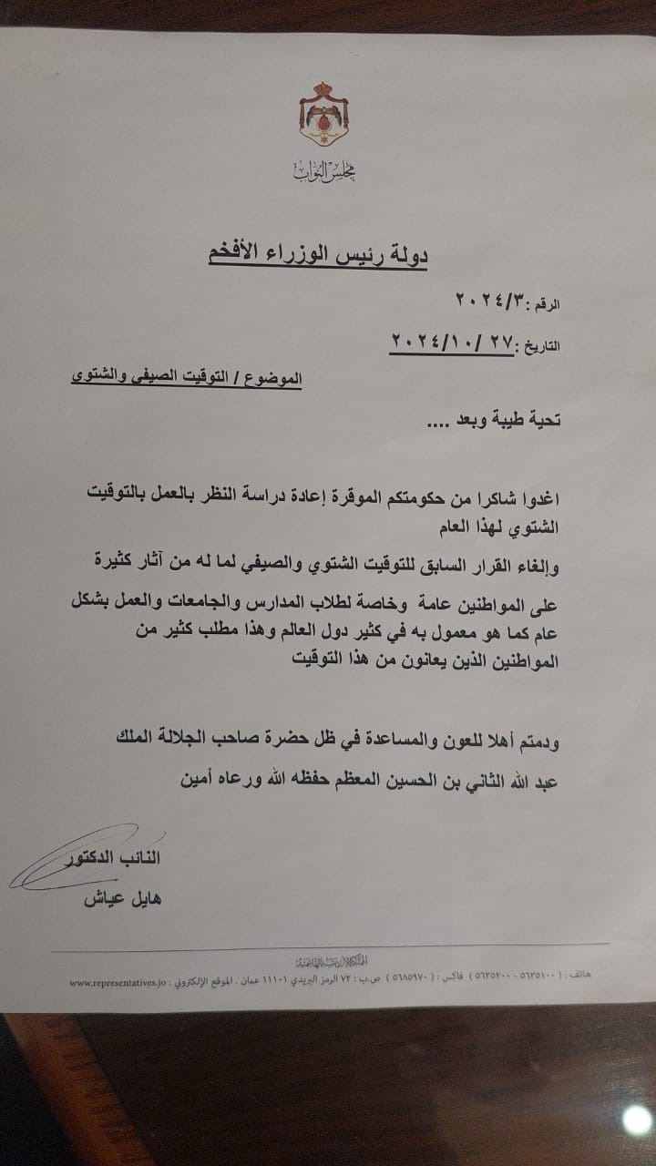 وجه النائب هايل عياش دعوة إلى رئيس الوزراء، جعفر حسان، لإعادة النظر في العمل بالتوقيت الشتوي لهذا العام، مطالباً بإلغاء القرار السابق بشأن التوقيت، نظراً لتأثيراته السلبية على المواطنين بشكل عام، وعلى طلاب المدارس والجامعات بشكل خاص. وأكد النائب أن هذا المطلب يعكس آراء شريحة واسعة من المواطنين الذين يعانون من هذا التوقيت. وعبر العديد من الطلاب الأردنيين، عبر منصات التواصل الاجتماعي، عن رغبتهم في أن يعيد رئيس الوزراء، جعفر حسان، العمل بنظام التوقيت الشتوي، مشيرين إلى أن هذا التوقيت سيساهم في تيسير خروج الطلاب إلى المدارس وتوجه الموظفين إلى أماكن عملهم. وعبّر الطلاب عن قلقهم من اضطرارهم للخروج في الصباح الباكر قبل شروق الشمس، حيث تتطلب الظروف وجود الأهالي معهم نظراً للمخاوف من الظلام والكلاب الضالة، إلى جانب برودة الطقس الصباحية. ويعتمد نظام التوقيت الشتوي على تأخير الساعة بمقدار 60 دقيقة، مما يعني أن الساعة الواحدة صباحاً تصبح منتصف الليل، مما يتيح للطلاب وقتاً أفضل للاستعداد والخروج في ساعات أقرب إلى ضوء النهار. كما أبدى مواطنون يوم الجمعة استياءهم من تغيير تلقائي في ساعات الهواتف الذكية، الذي يحدث نتيجة الانتقال الأوتوماتيكي إلى التوقيت الشتوي، ما أثار حالة من الإرباك بينهم. يذكر أن الحكومة قررت عام 2022 إلغاء العمل بالتوقيت الشتوي، وتثبيت التوقيت الصيفي طوال العام. من جانبه، أفاد مصدر رسمي في تصريح سابق بأن الحكومة الجديدة لن تتراجع عن قرار تثبيت التوقيت، الذي أقرته حكومة الخصاونة. وأضاف المصدر أن الحكومة ماضية في تطبيق قرار تثبيت التوقيت. يذكر أن الحكومة قررت في عام 2022 إلغاء العمل بنظام التوقيت الشتوي واعتماد التوقيت الصيفي طوال العام